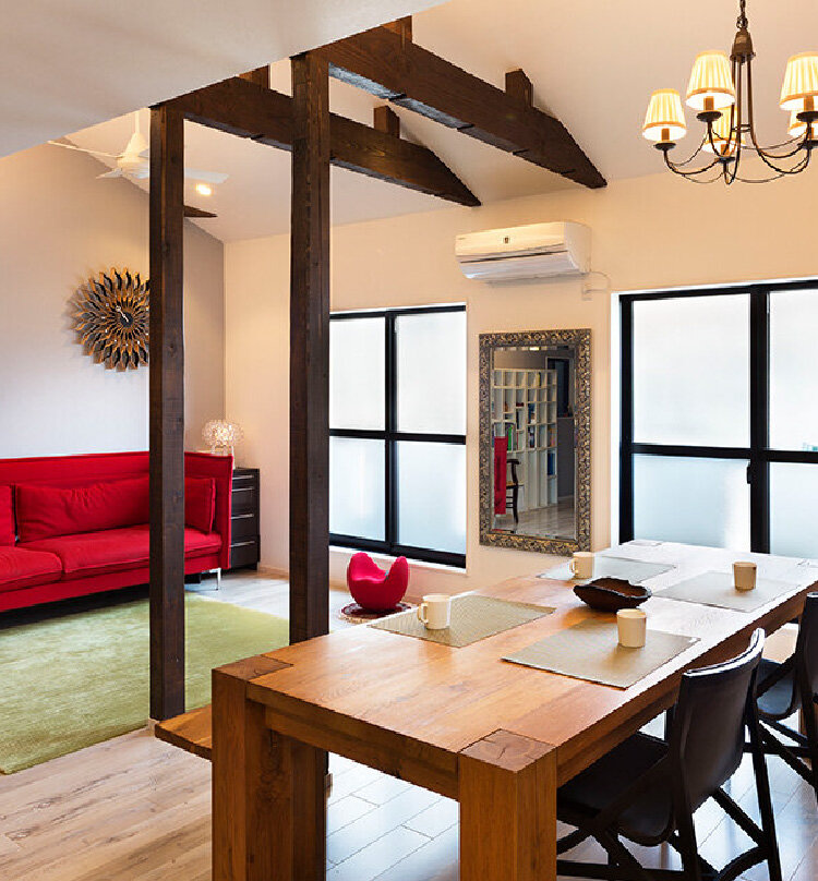 ●構造上はずせない柱は、美しく塗装し空間のアクセントに。
