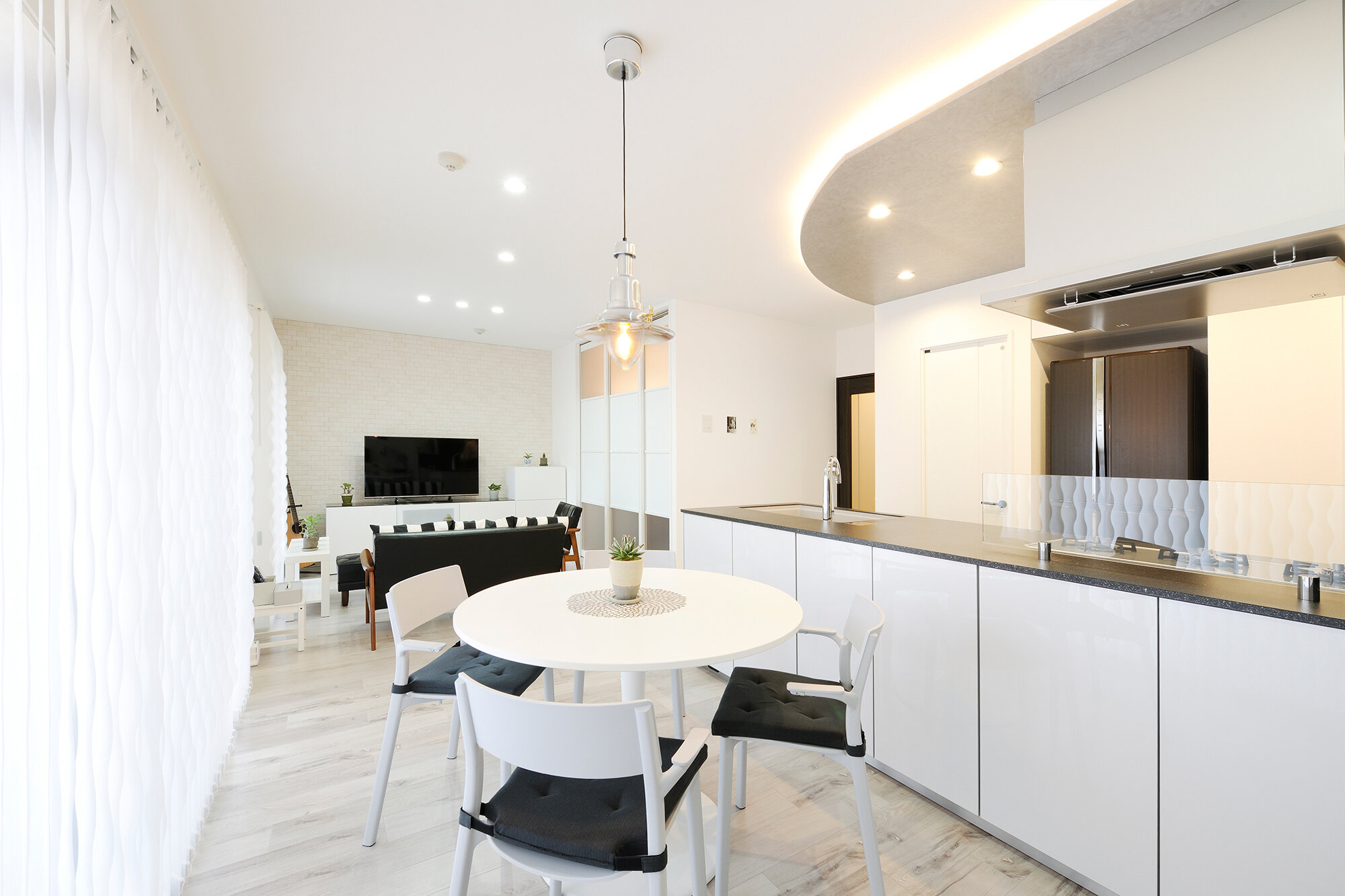 アールのついた吊天井と間接照明が素敵なペニンシュラキッチンは奥さまのお気に入り。白いキャビネットに黒い人造大理石のワークトップをコーディネートしました。