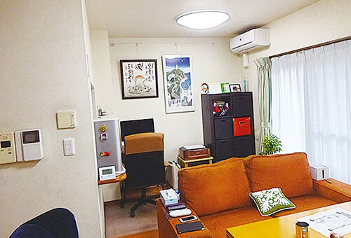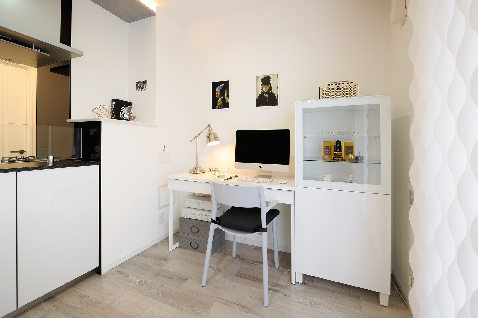 ダイニングの奥に設けられた書斎コーナー。お気に入りのポストカードやオブジェでおしゃれに演出。パソコンやデスクワークなど、ご夫妻で使われています。