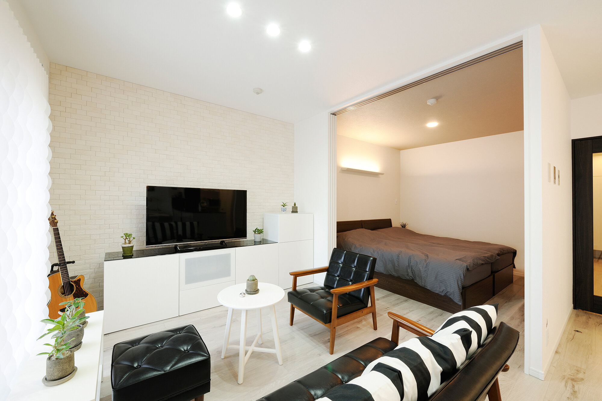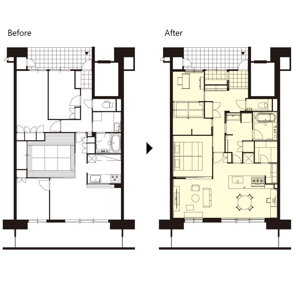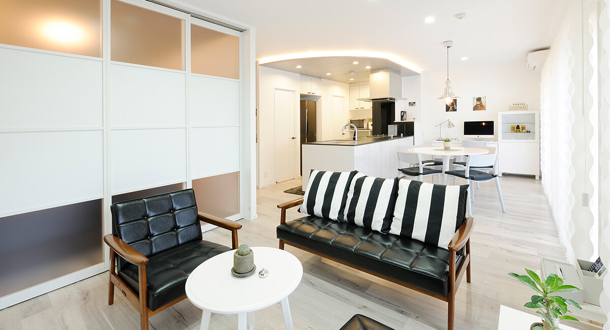 目指されたのは、ご夫妻の感性を生かしたおしゃれでモダンなインテリアと、暮らしやすい動線や収納でした。南側の洋室とLDKを一体化して広々とした団らん空間に一新。ホワイトオークのフロアに厳選した家具をコーディネート。お気に入りのモノトーンのインテリアになりました。キッチンは開放的なペニンシュラタイプに。「ショウルームで見て、すっかり気に入って」と奥さま。リビングに隣接した和室は洋室にしてご夫妻の寝室に。北側に2つあった洋室はご長男の部屋と収納に。バスルームなどの水まわりと玄関ホールは、廊下位置を変更してスペースを拡張。「同じ広さなのに、こんなに快適で便利に変わるなんて感激です」とご夫妻ともに大満足のリノベーションとなりました。