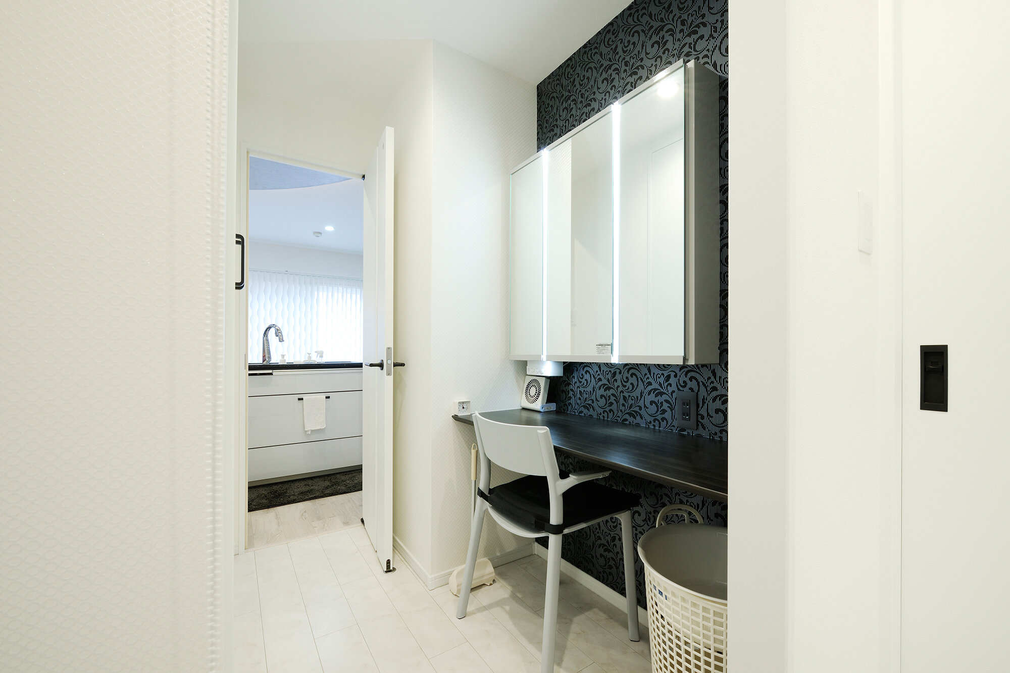 奥さまのパウダールームも新設。キッチンへの動線にも配慮しています。