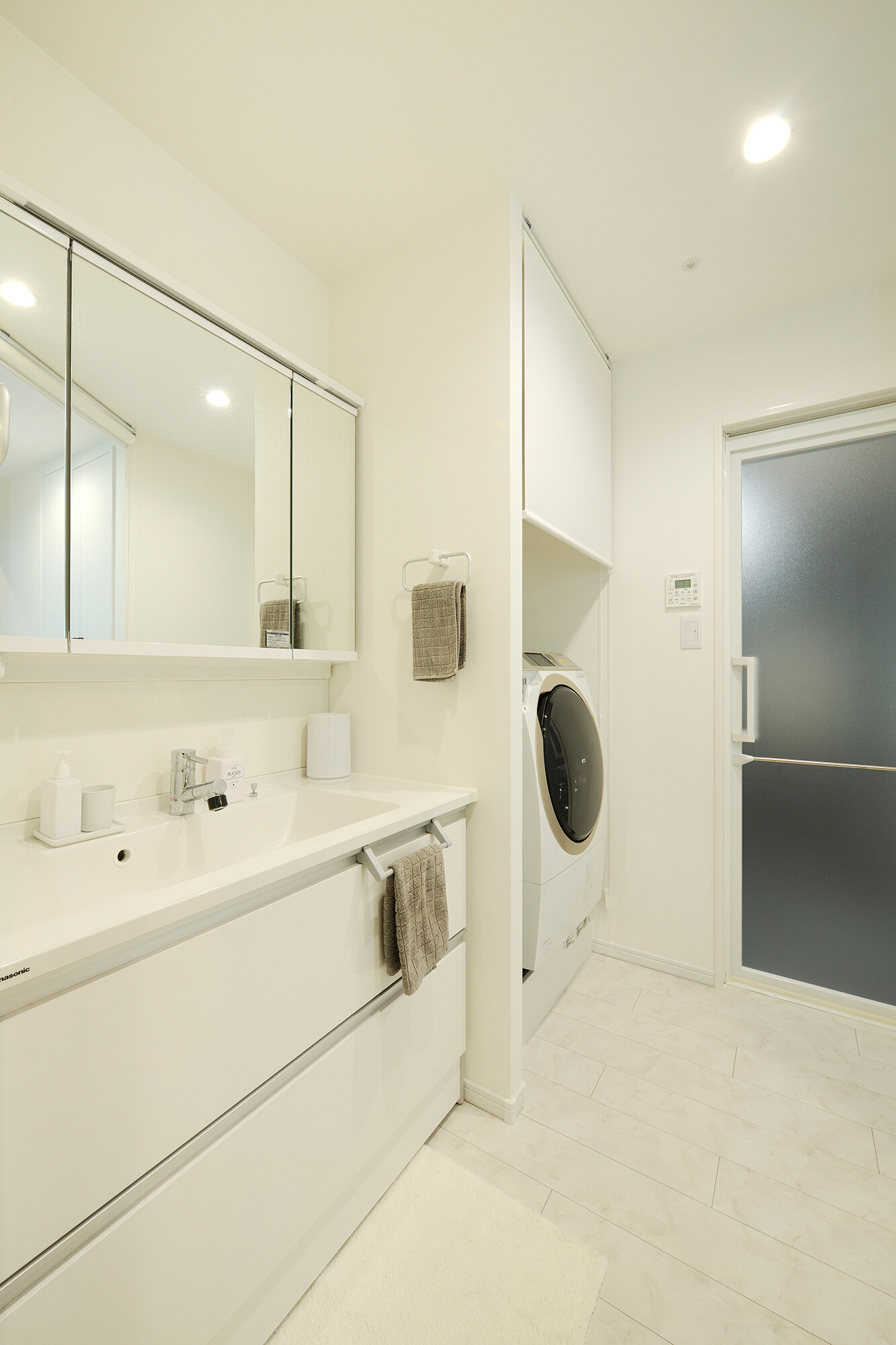 洗面室は、間取り変更で広さを確保し、天井には室内物干しを取り付けました。