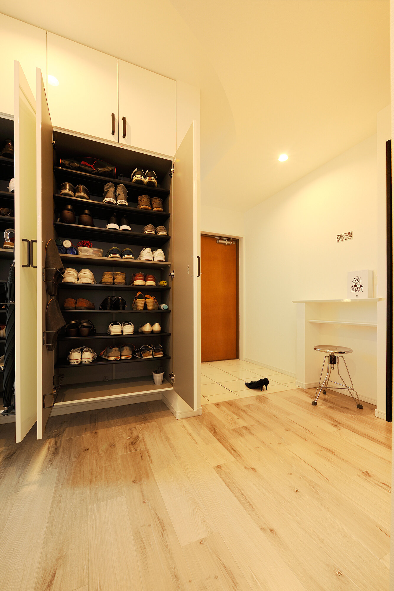 壁面には、ご家族の靴がたっぷり収納できるスペースを設けました。