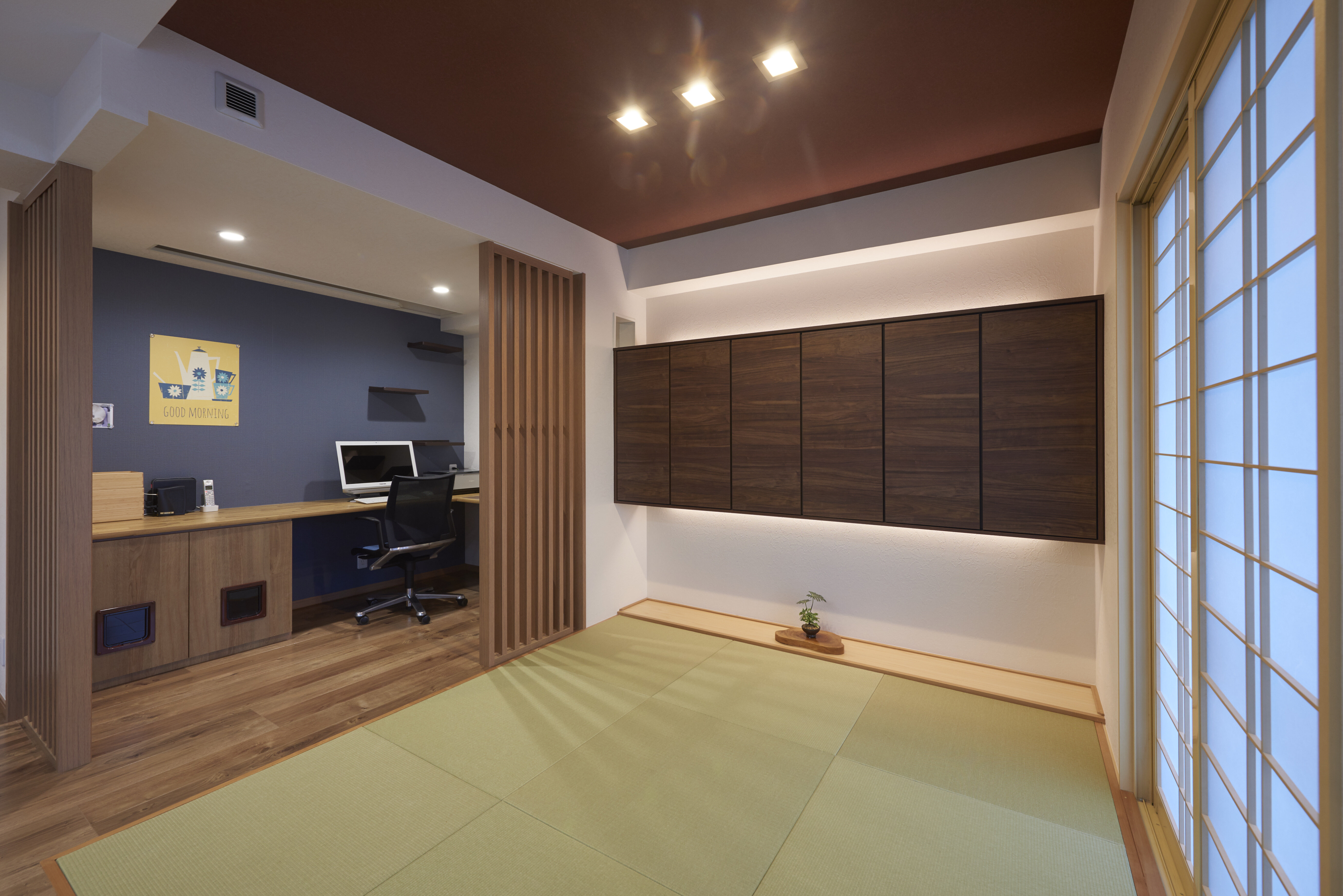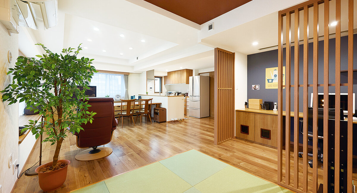 元の和室をモダンな畳コーナーに。リビングとひと続きの、ゆったり落ち着く和の空間です。押し入れ部分はワークスペースに。竪格子がほどよい独立性をつくります。