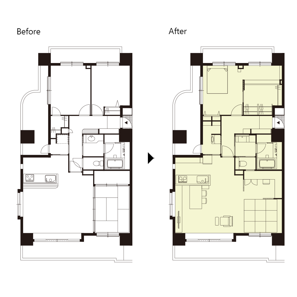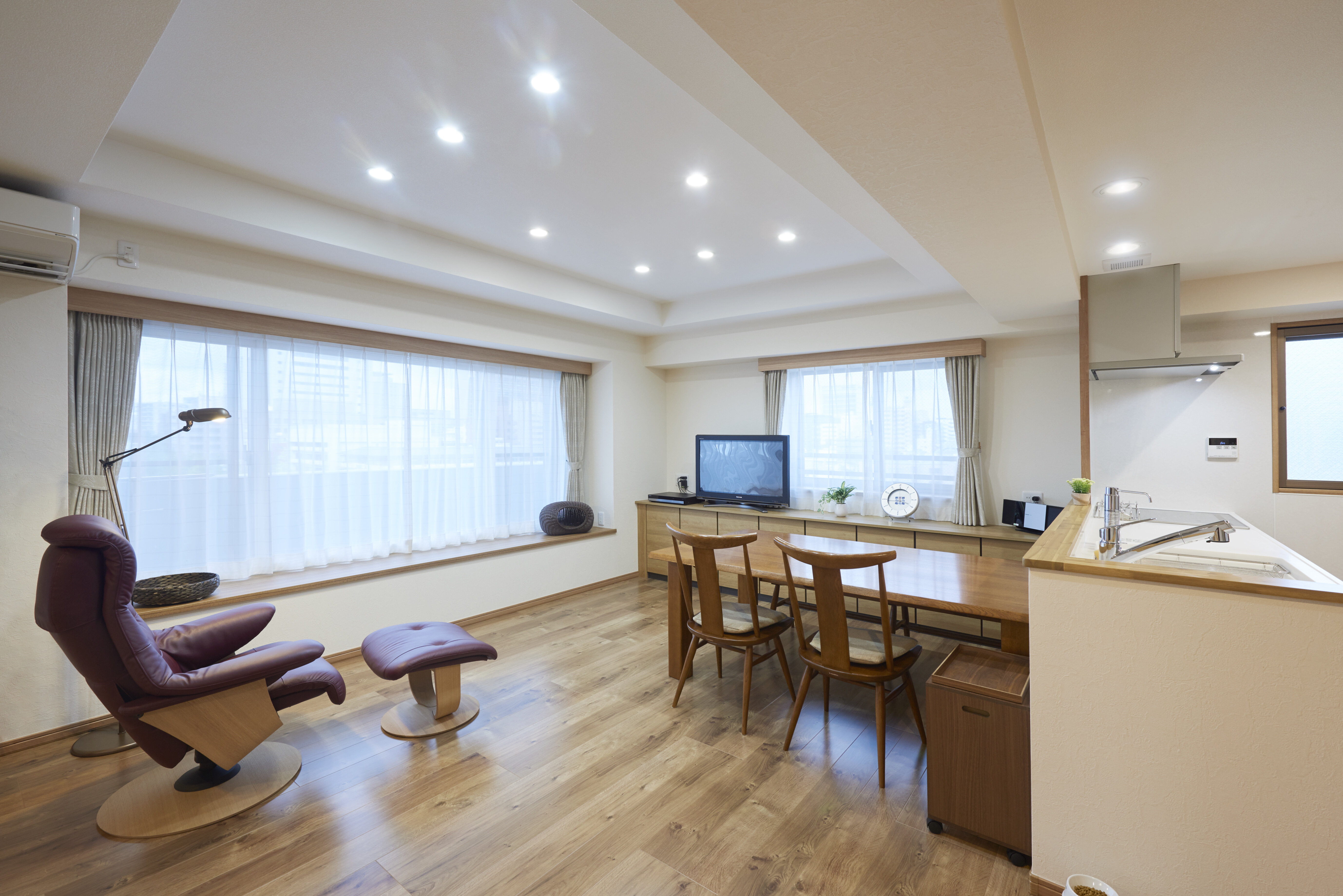 目指したのは開放感と、ゆとりのある暮らしやすい住まい。元の和室を撤去して、広々としたLDKとモダンな畳コーナーが実現しました。木の感性を生かしたナチュラルで開放感いっぱいの空間です。押し入れだった場所は、用途により奥行きを変えたL型のカウンターデスクを設けてワークスペースに変更。2つの洋室はゆとりある寝室に。広いウォークインクローゼットと大容量の書庫を併設した快適なプライベート空間になりました。不具合のあった水まわりは最新設備に取り替えるなど、問題点をすべて解決。「どこにいても開放感を満喫できて、リラックスできます」とご夫妻。ご要望以上の仕上がりになったようです。