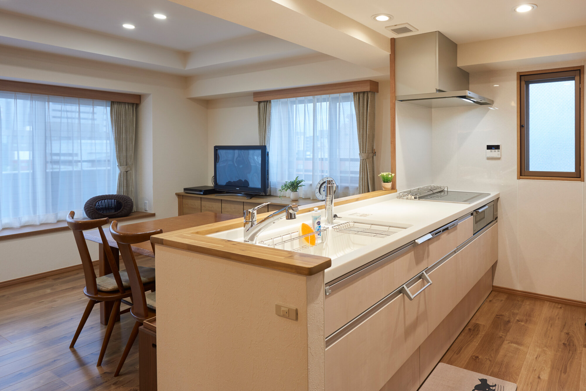 吊戸棚をなくして明るく開放的になったキッチン。大容量のカップボードを新設したので、全体の収納力もアップしました。