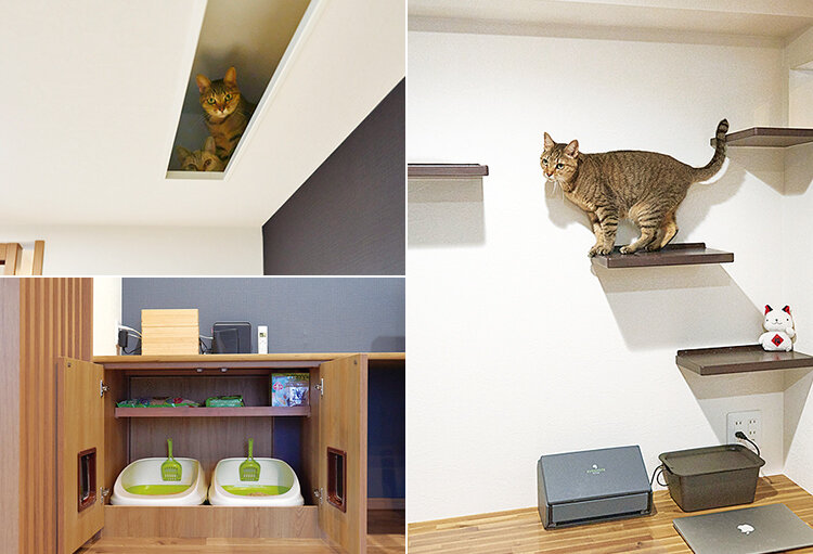 2匹の愛猫のための配慮も隅々に。ワークスペースの壁にはキャットステップ、天井のふところ部分には隠れ家と通路を設置。デスク下には猫用トイレを組み込み、隣のトイレからも使えるように。