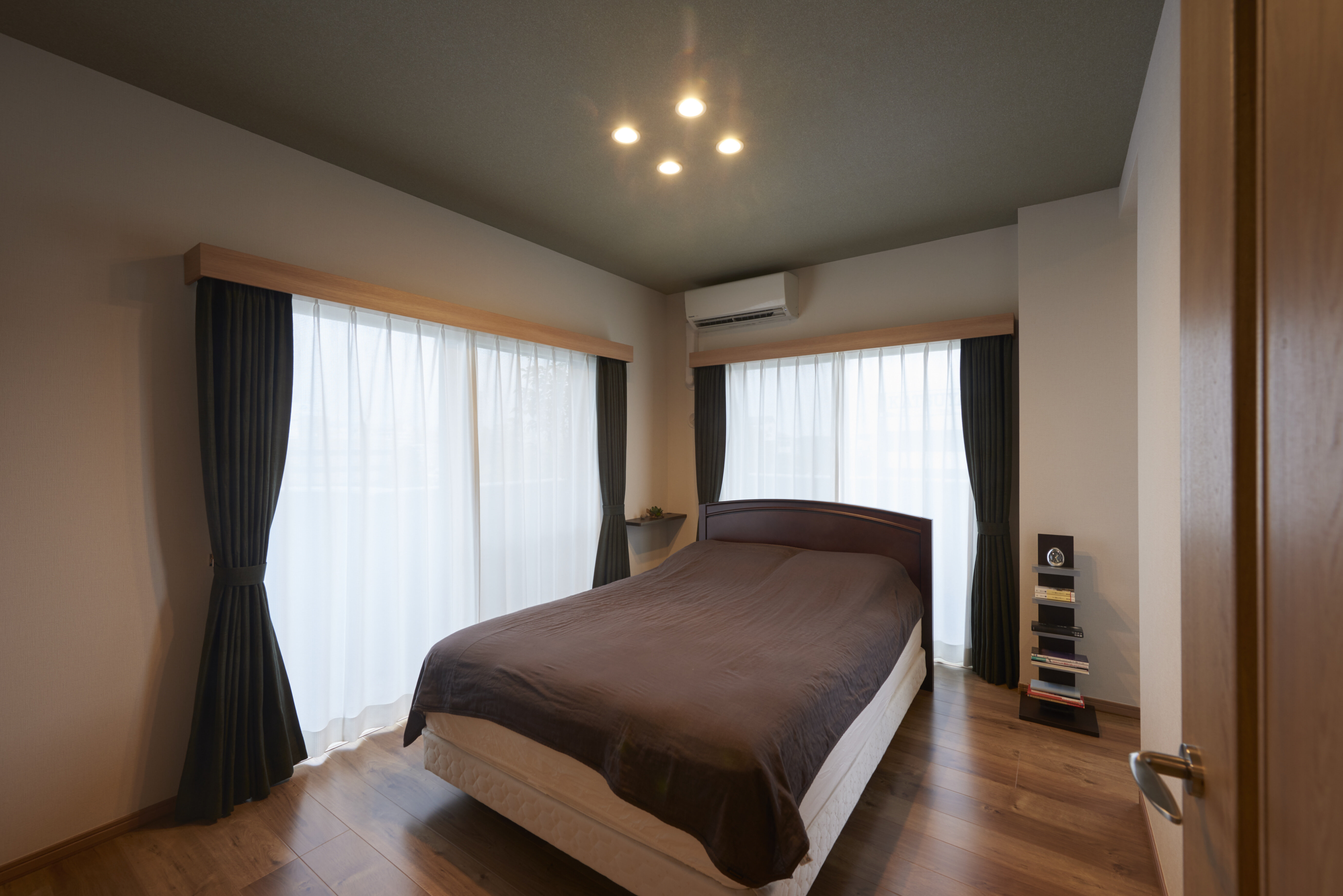 独立した2つの洋室を合体させてご夫妻の寝室に。快適に休めるよう天井とカーテンには落ち着いたカラーを選択。併設された広いウォークインクローゼットと書庫のお陰で、家中が片付けやすく。