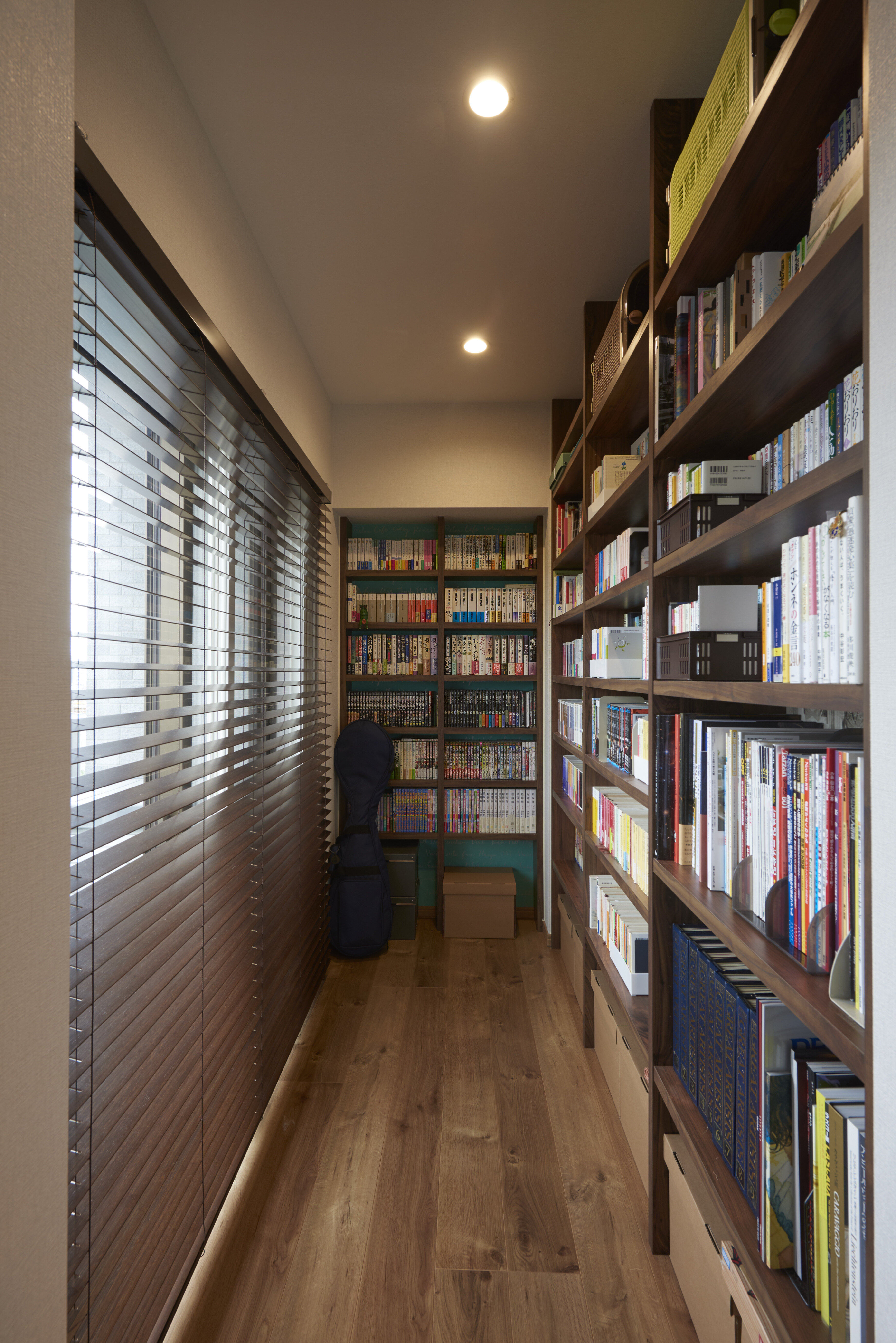 寝室から続く書庫スペース。2面の書棚はそれぞれ奥行きを変えてあるので、さまざまなサイズの本を効率よく収納できます。
