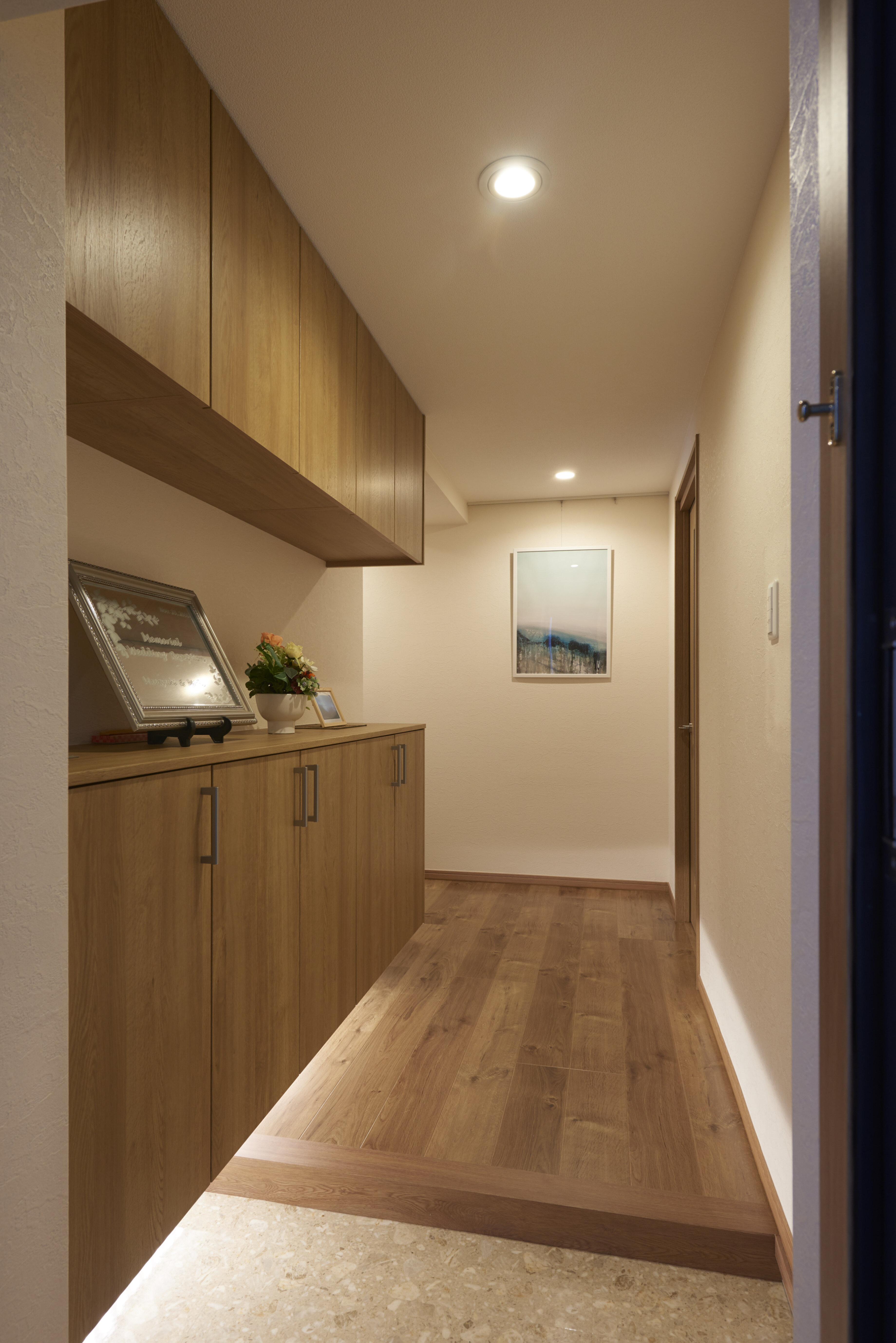 玄関は人感センサーを備えた間接照明でスタイリッシュな雰囲気を演出。シューズボックスの容量を増やしたことで、すべての靴がすっきりと収まります。