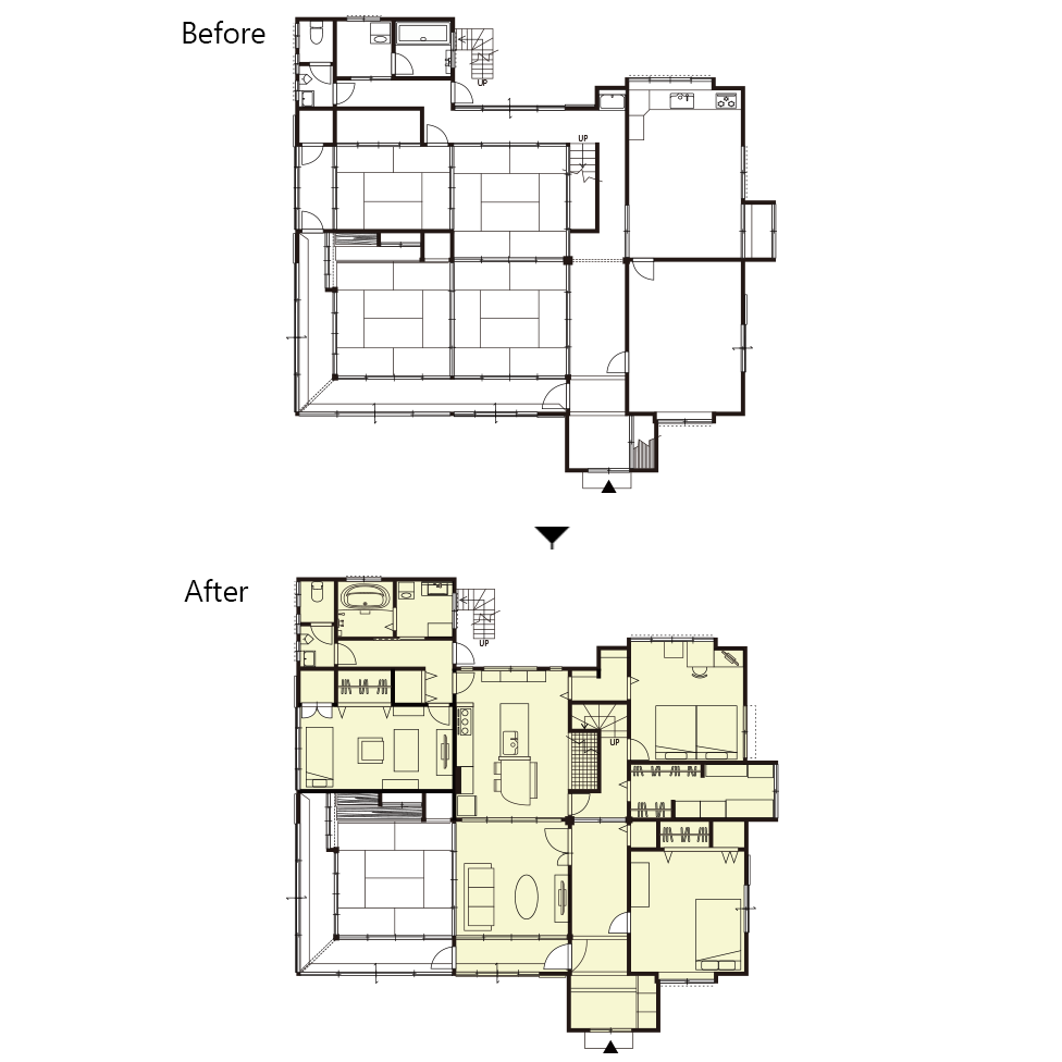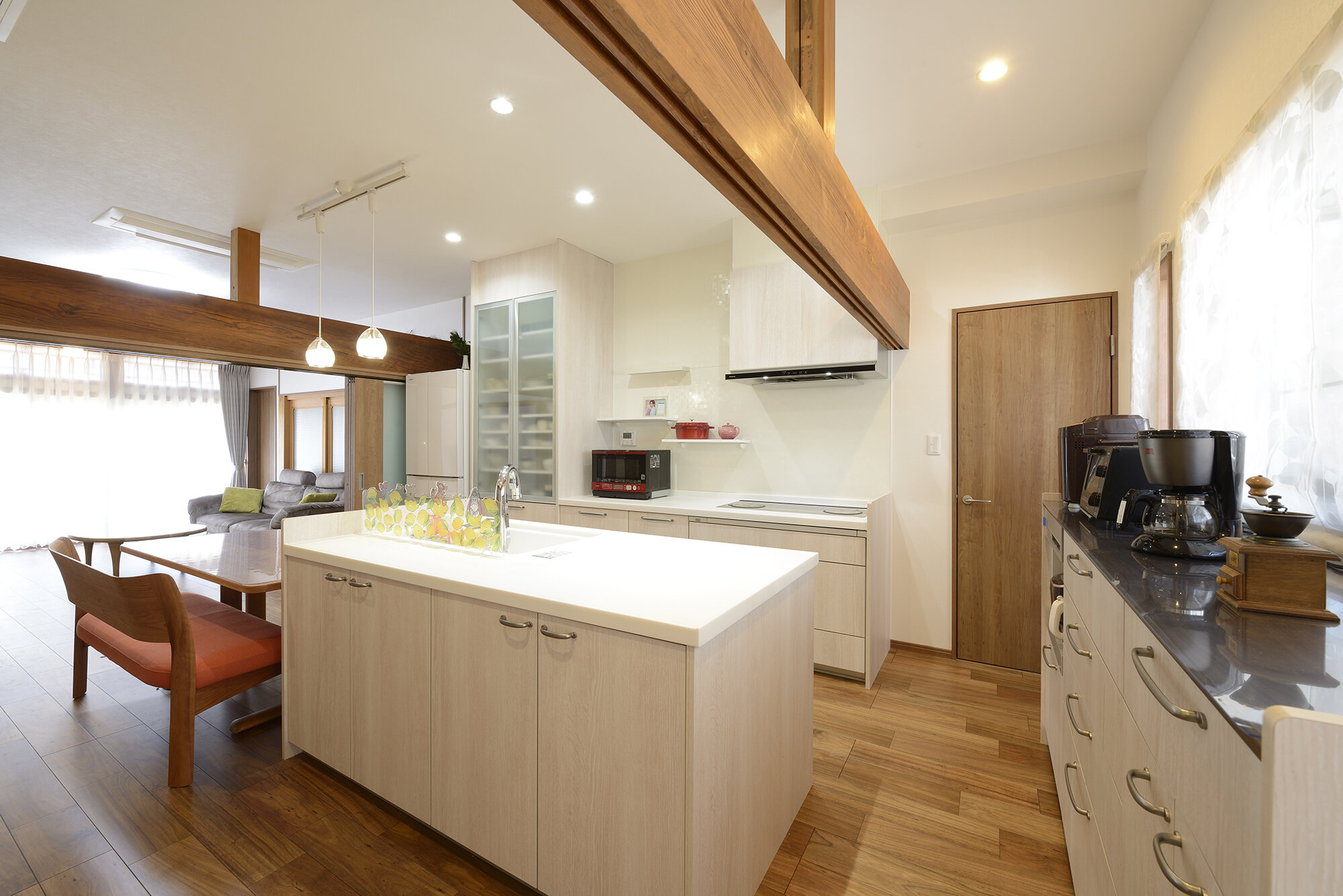 建物の老朽化や部屋数の見直しをきっかけに、リノベーションをご計画されたTさま。家の中央にあった2間続きの和室と廊下をゆとりあるLDKに。キッチンはII型で窓辺にカフェコーナーを設けました。もうひとつの和室はご長男用の洋室に。構造材でもある差鴨居は残し、新たな内装と調和する和モダンな印象にしています。キッチンから主寝室へはウォークスルータイプのパントリーでつながり、廊下側から使えるウォークインクローゼットも設置しました。お子さま方が里帰りする時に使えるゲストルーム、水まわりもリフレッシュ。空間がすっきりし、ご家族がくつろげるお住まいになりました。