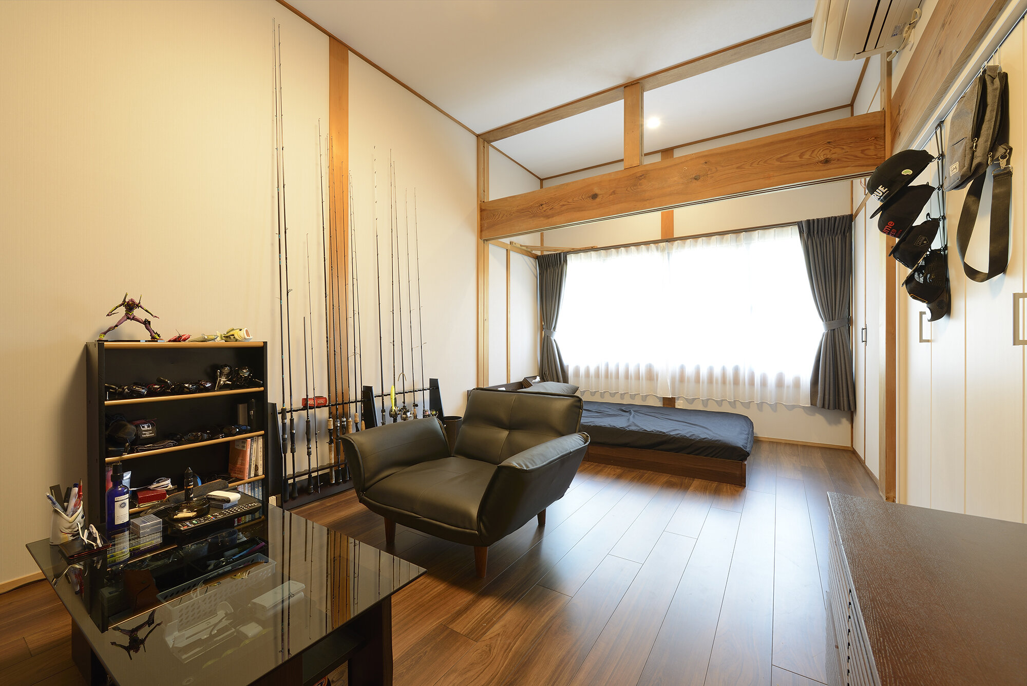 ご長男が使われていた部屋は、和室と広縁を洋室へ。差鴨居でベッドとリビングスペースが分かれ、押入れは大容量の収納に変えました。