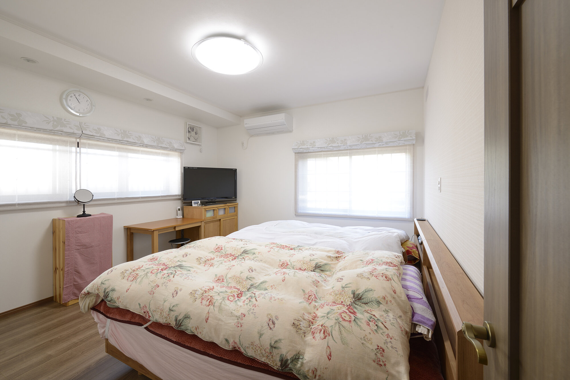 廊下とパントリーの両方につながる主寝室は、さわやかな雰囲気に。窓の取り替え、内窓追加で暖かさがアップしています。