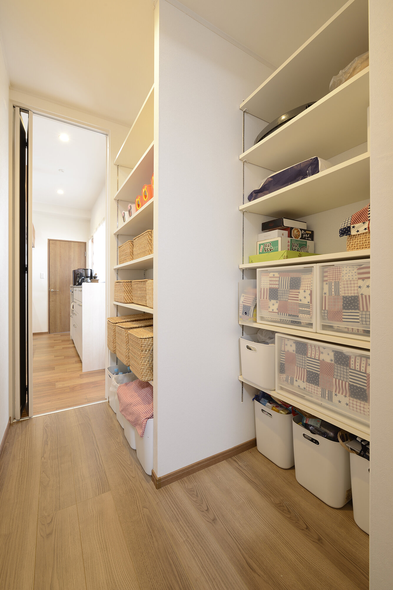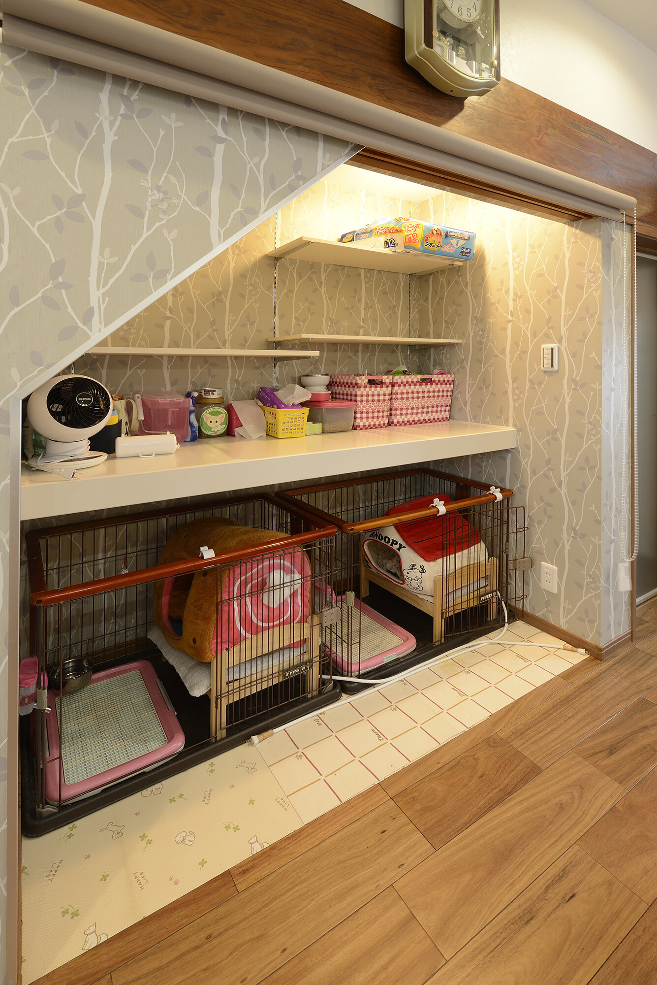 階段下はロールスクリーン付きペット収納に。主寝室とキッチンとの間はウォークスルーのパントリーで収納量が増えました。