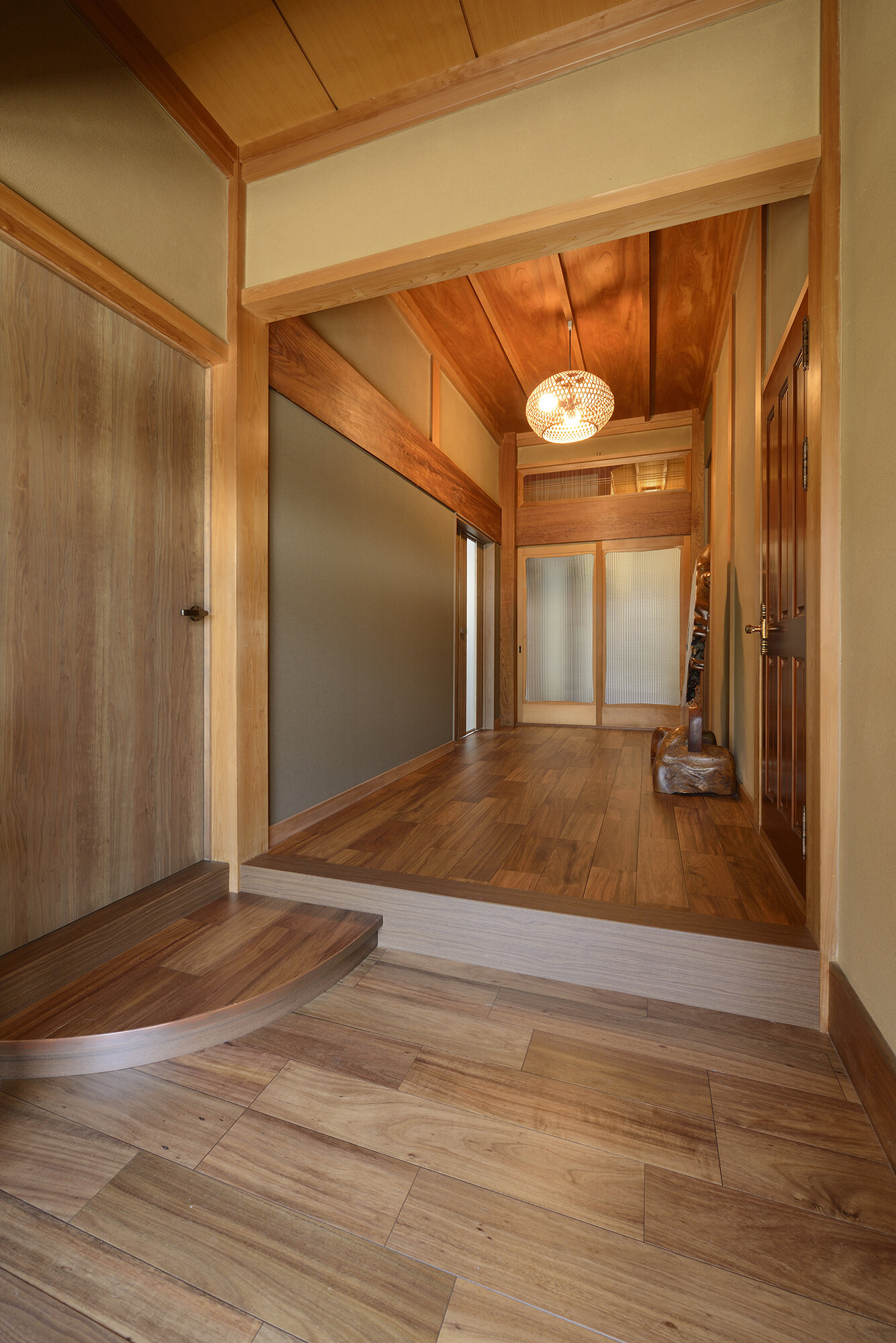玄関ホールから廊下は床材を重ね貼り。左手は引戸から壁に変えてクロスを貼っています。廊下には掃除用品が入る収納も設置。