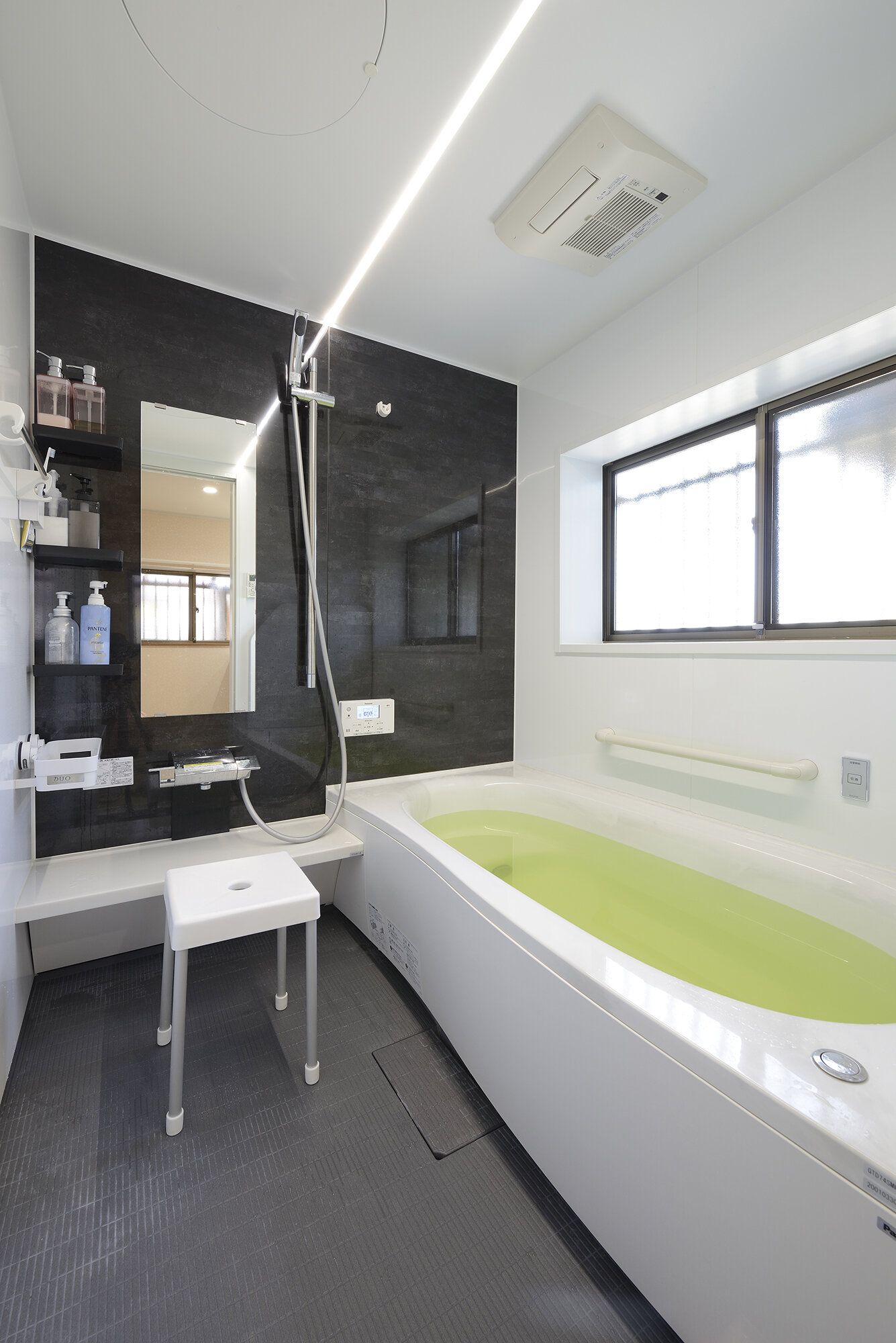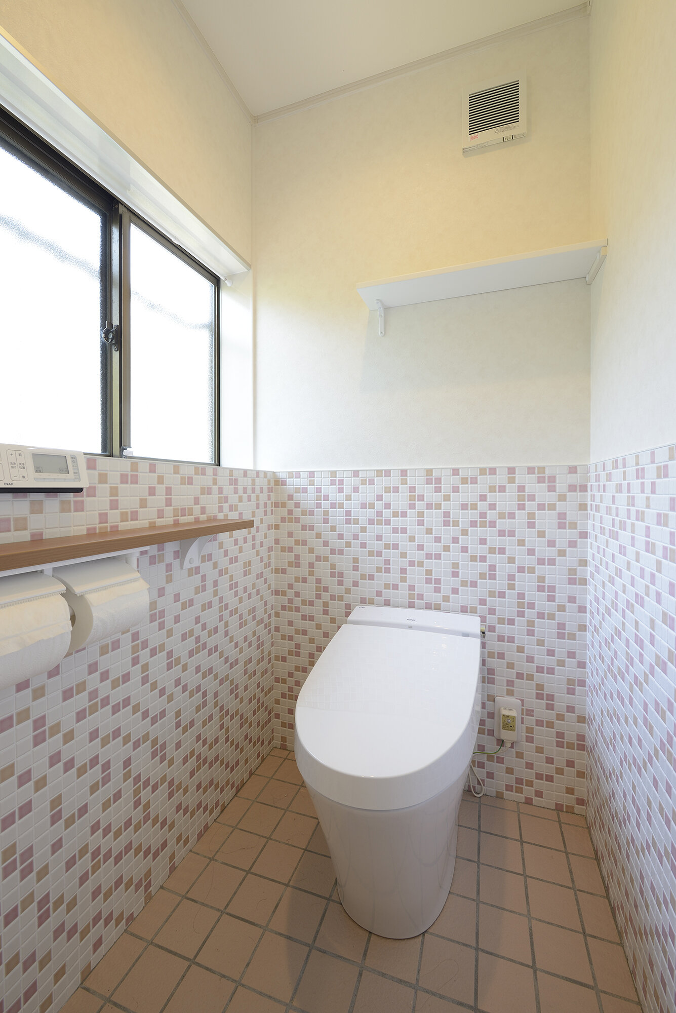 バスルームは落ち着きのある色調を選ばれました。トイレは奥さまのご希望で床と壁の一部をタイル貼りにして水洗いできるように。