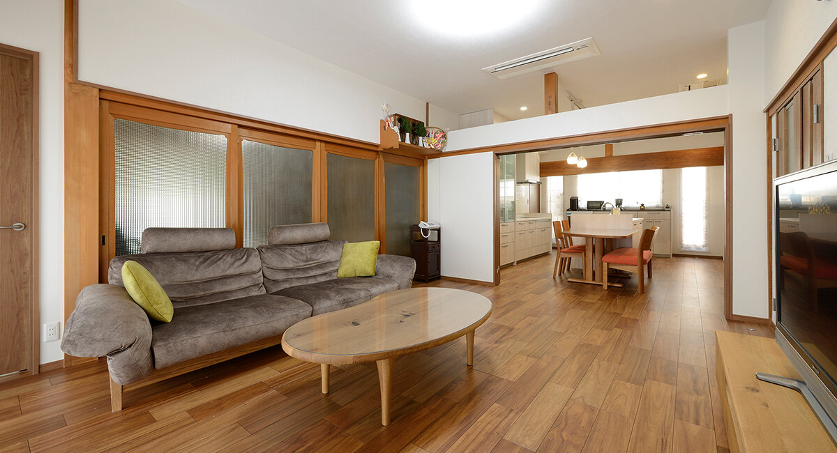 木のぬくもりが感じられるリビングは、既存ガラス引戸を活かし、廊下側のドアは新設。ダイニングとは引違い戸で仕切り可能です。