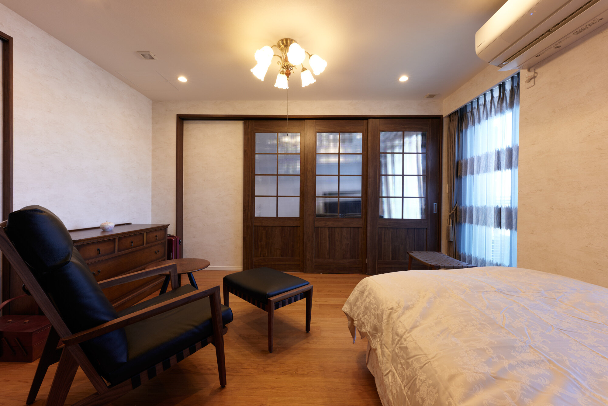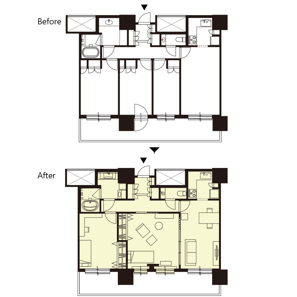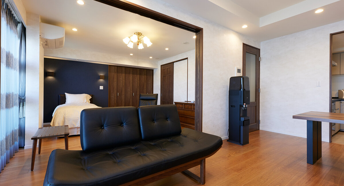 生活の変化に伴い、ゆったり過ごせるよう3LDKから2LDKにリノベーションされました。2つの洋室を1室にしたSさまの寝室は、広々と落ち着いた空間に。さらにリビングダイニングとの間の壁を撤去し3枚連動引戸で間仕切りしたことで、さらに広く使えるようになっています。もうひとつの洋室はご長男の個室で、それぞれ収納スペースを増やして使いやすさも向上。キッチンをはじめ水まわりは設備、内装を入れ替えてグレードアップしています。天然木フローリング、「ベリティス クラフトレーベル」の建具やこだわりの家具、建築化照明によって、上質で安らぎを感じられるお住まいが完成しました。