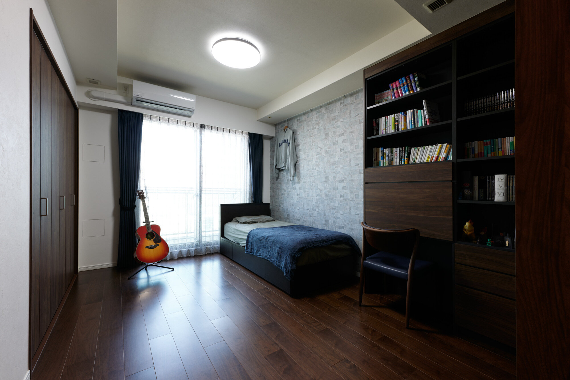 ご長男の個室はアクセントクロスを貼りイメージを一新。「キュビオス」で壁面収納とデスクスペースを設け在宅勤務にも便利に。