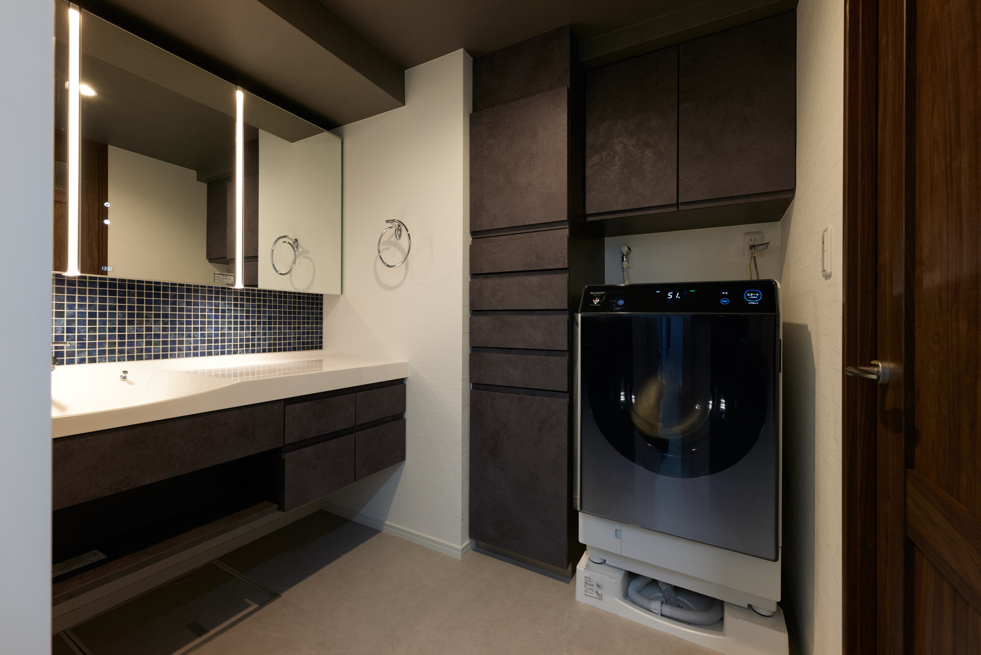 洗面室は「Lクラス ラシス」と「美ルックツインラインLED木製3面鏡」を設置。タッチレスで明るさや色が切り替えられて快適に。