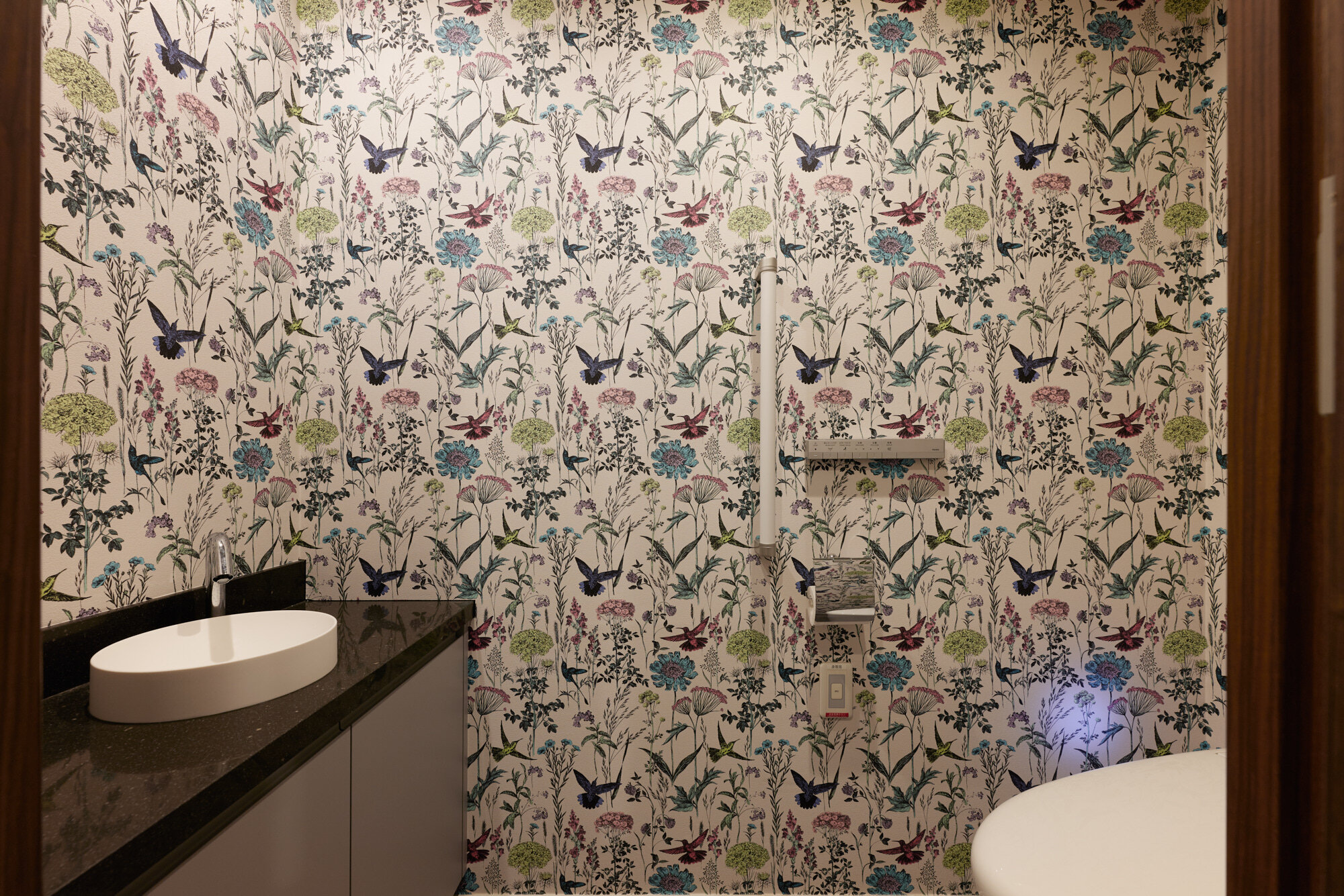 トイレは設備を入れ替え、手洗いは天然石風のカウンターとベッセルボウルを。ボタニカル柄のアクセントクロスで華やかに。