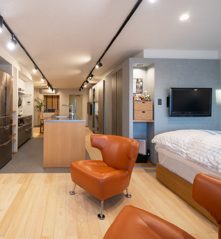 スケルトンから水まわり(バス、洗面、トイレ)を箱のように区切り、お客様をお招きするスペースと、プライベートスペースを分けたいというご要望をもとに提案させていただきました。ベッドスペースをリビング横に配置することでプライバシーを確保しています。リビングなどは和モダン、キッチンはスタイリッシュな印象に仕上がりました。