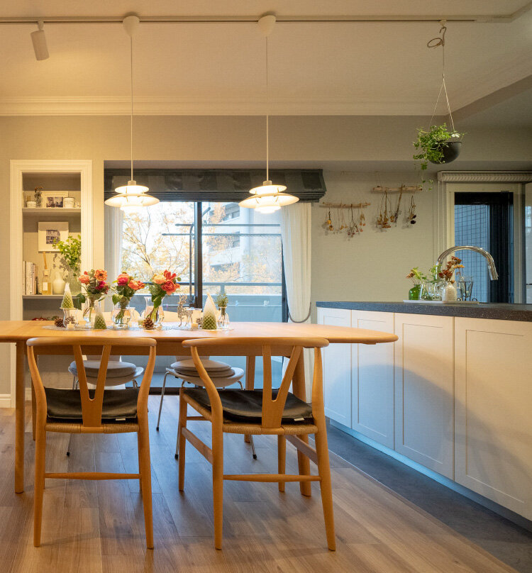 Tさまはお子さまの独立を機に、ご夫妻が暮らしやすい住まいにするためスケルトンリフォームを希望されました。和室は撤去してリビングダイニングを広く、キッチンはシンク側がアイランドのII型に変えています。リビングの隣には引戸で仕切られる約3帖分のヌックを設置。随所にモールディングを施して、お気に入りのインテリアグッズが飾れるくつろぎの空間が完成しました。