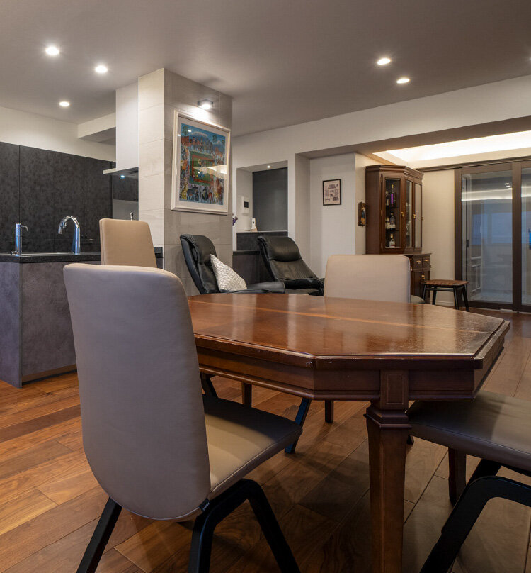 Sさまはマンション内の広い住戸への住み替えを機に、3LDKから2LDK+シューズインクローゼットへリノベーションされました。以前のお住まいはエレガントな雰囲気でしたが、今回は、ぐっと雰囲気を変えてグレーを基調としたモダンなLDKに一新。平日は奥さまのお料理に合わせてご主人がお酒をマリアージュ。休日にはご友人も加わられて、一緒に料理を作って、食べて、会話を楽しめる空間になりました。
