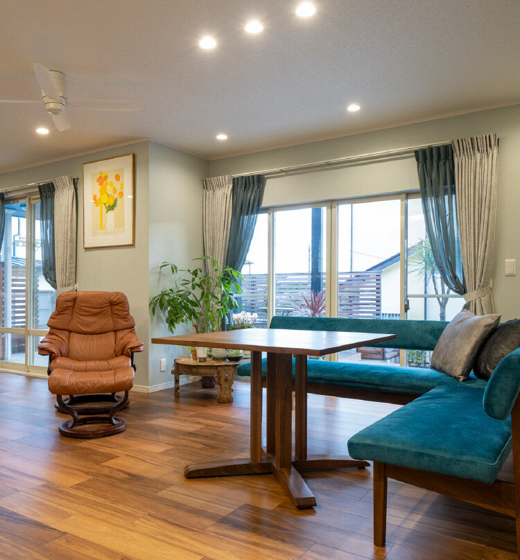 LDKは広くて好きな色合いになってくつろげますし、「リビングライコン」で照明を切り替えて楽しんでいます。庭は土埃の掃除や草むしりから解放され、水をかけておけばきれいに保てるようになってうれしいですね。複層ガラスに取り替えて、室内は冬でも寒さをあまり感じなくなりました。