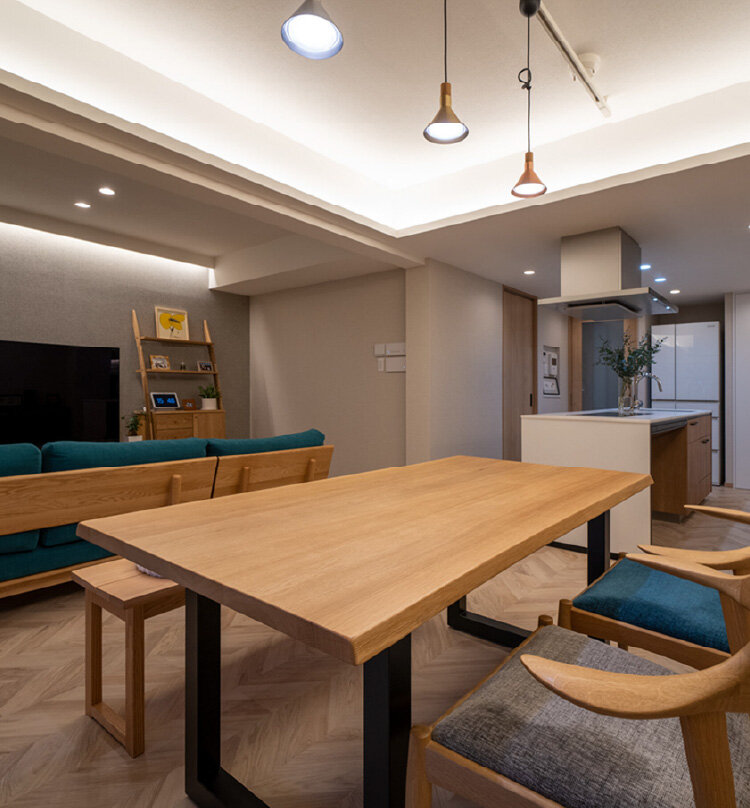 床を上げたから天井が低く感じるのではと心配でしたが、間接照明を提案してもらい、部屋全体が明るくなって開放感もあります。LDKが広くなったから新調したダイニングチェアに座って、お酒を飲みながらテレビを観たり音楽を聴いたりするのが楽しみです。
