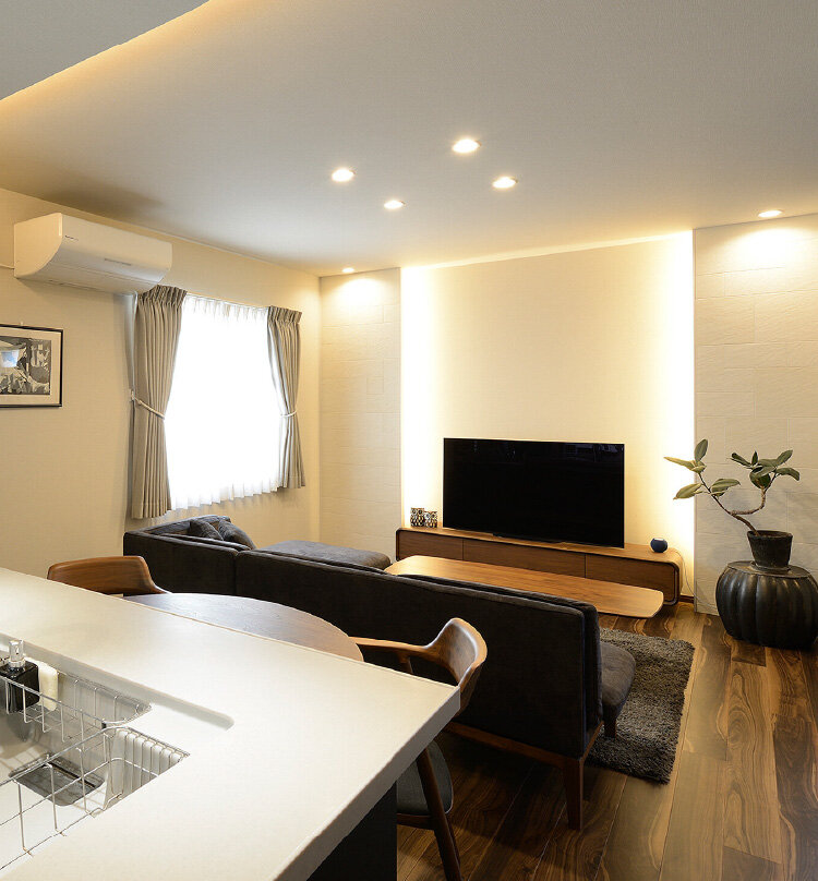 設備の老朽化を機に、室内のイメージを一新したいと考えられたNさま。リビングは窓の一部を塞いで調湿タイルを貼り、間接照明を加えたテレビスペースを造りました。隣の和室はモダンなデザインに変えています。また、ダイニングとキッチンとの間の垂壁は撤去してフルフラット対面タイプのキッチンに。開放感とゆとりのあるLDKが生まれました。