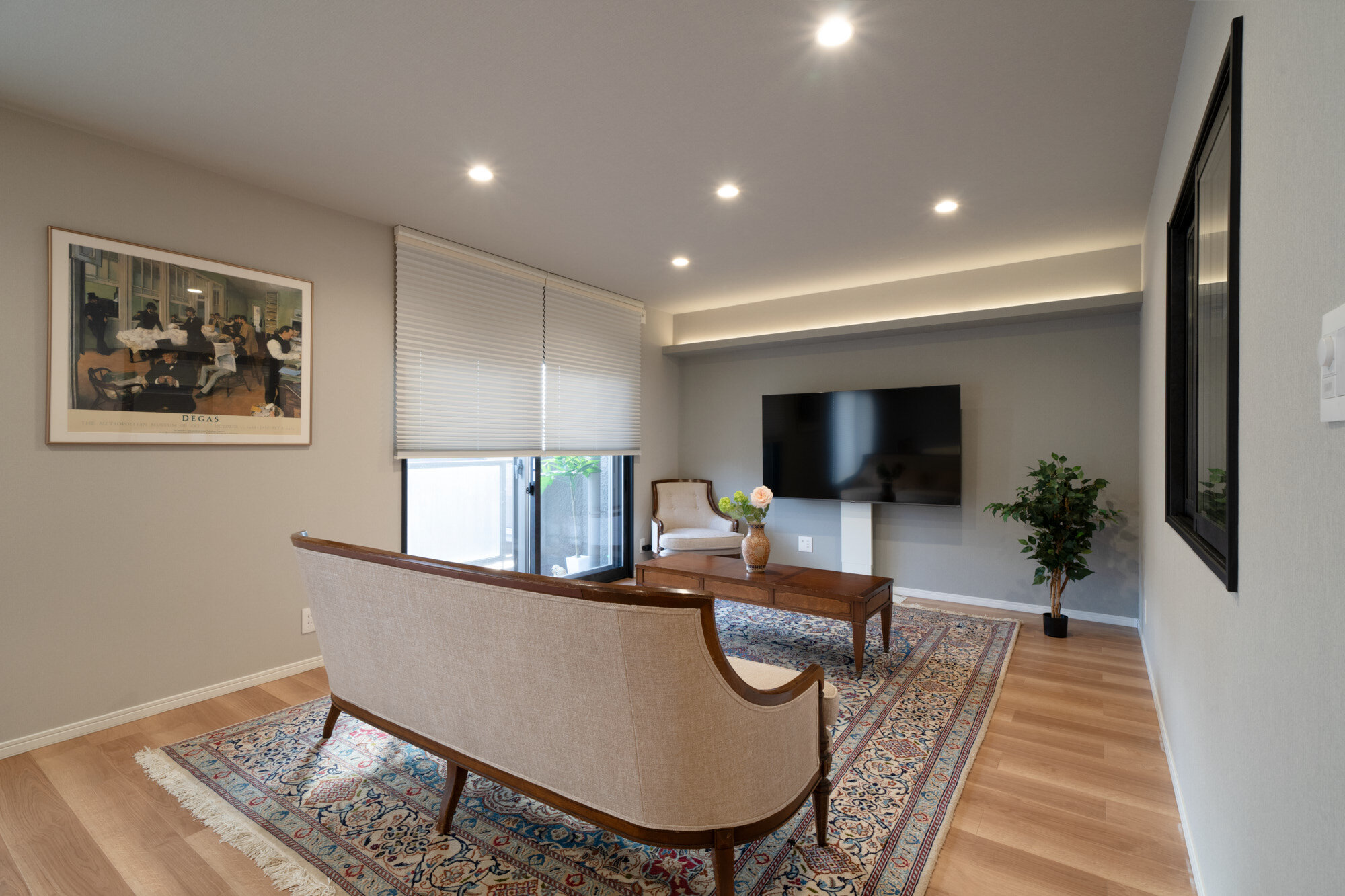 バルコニー側に内窓を取り付け天井からプリーツスクリーンを。テレビ側はコーブ照明で演出しています。