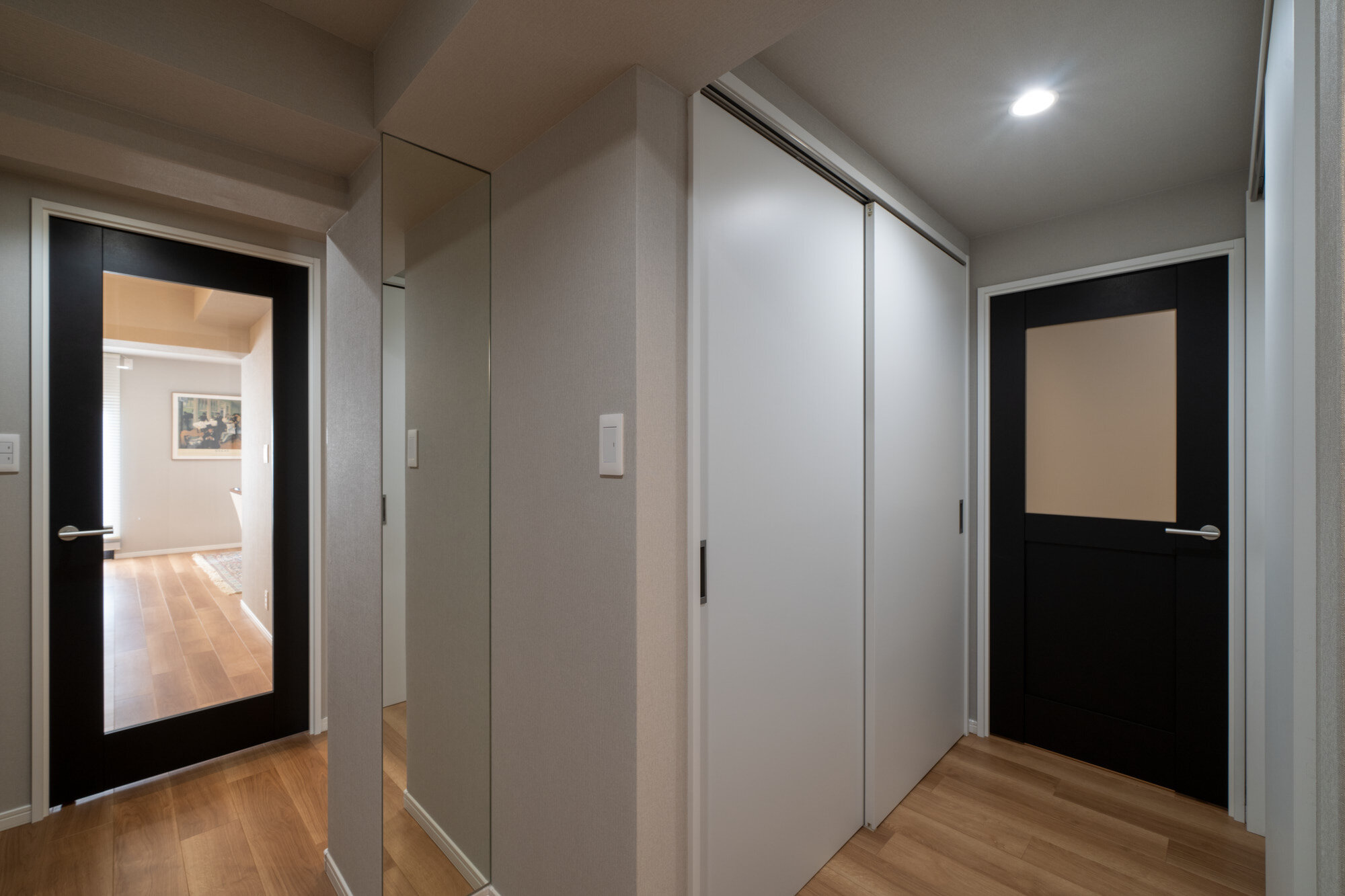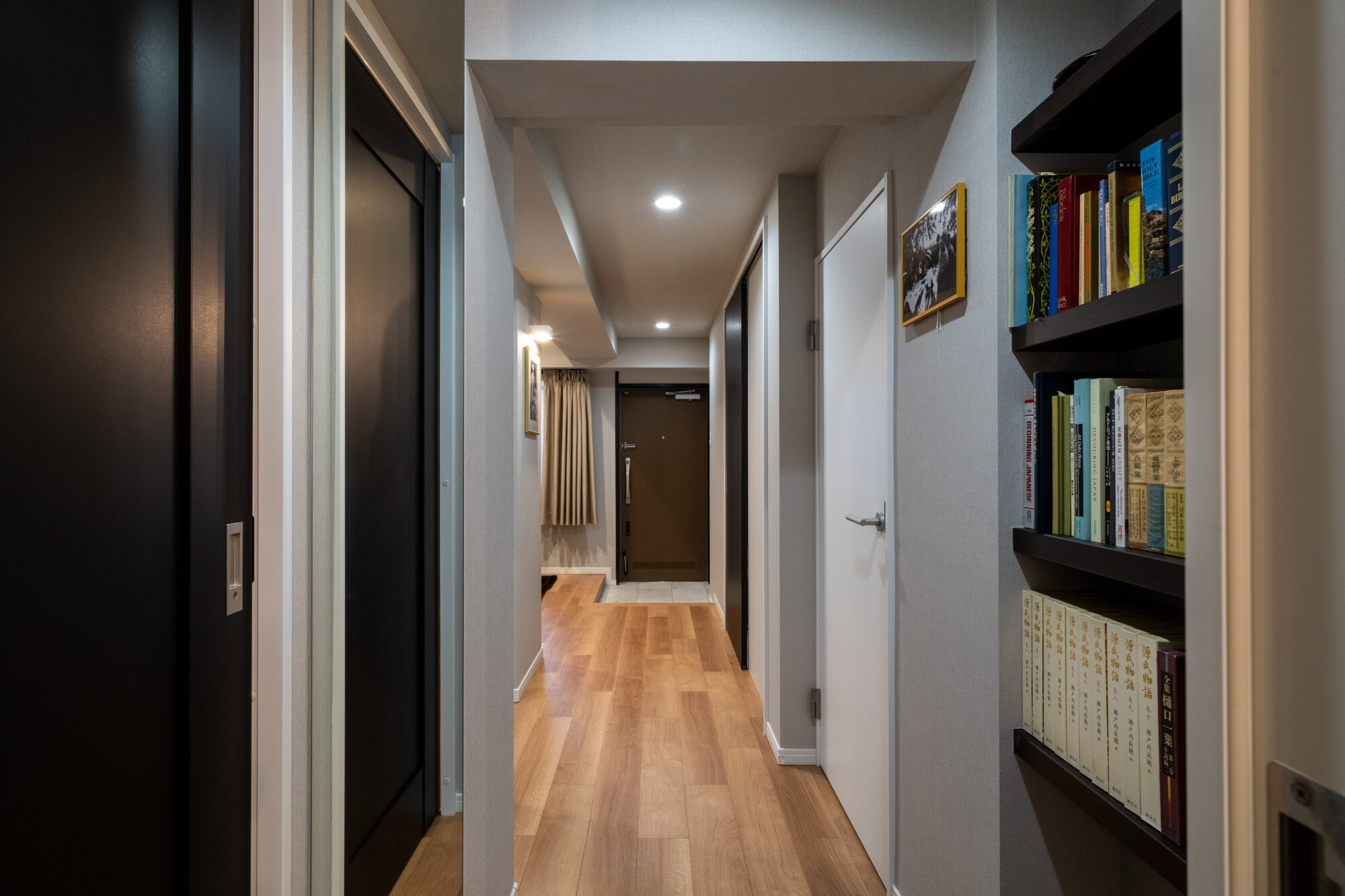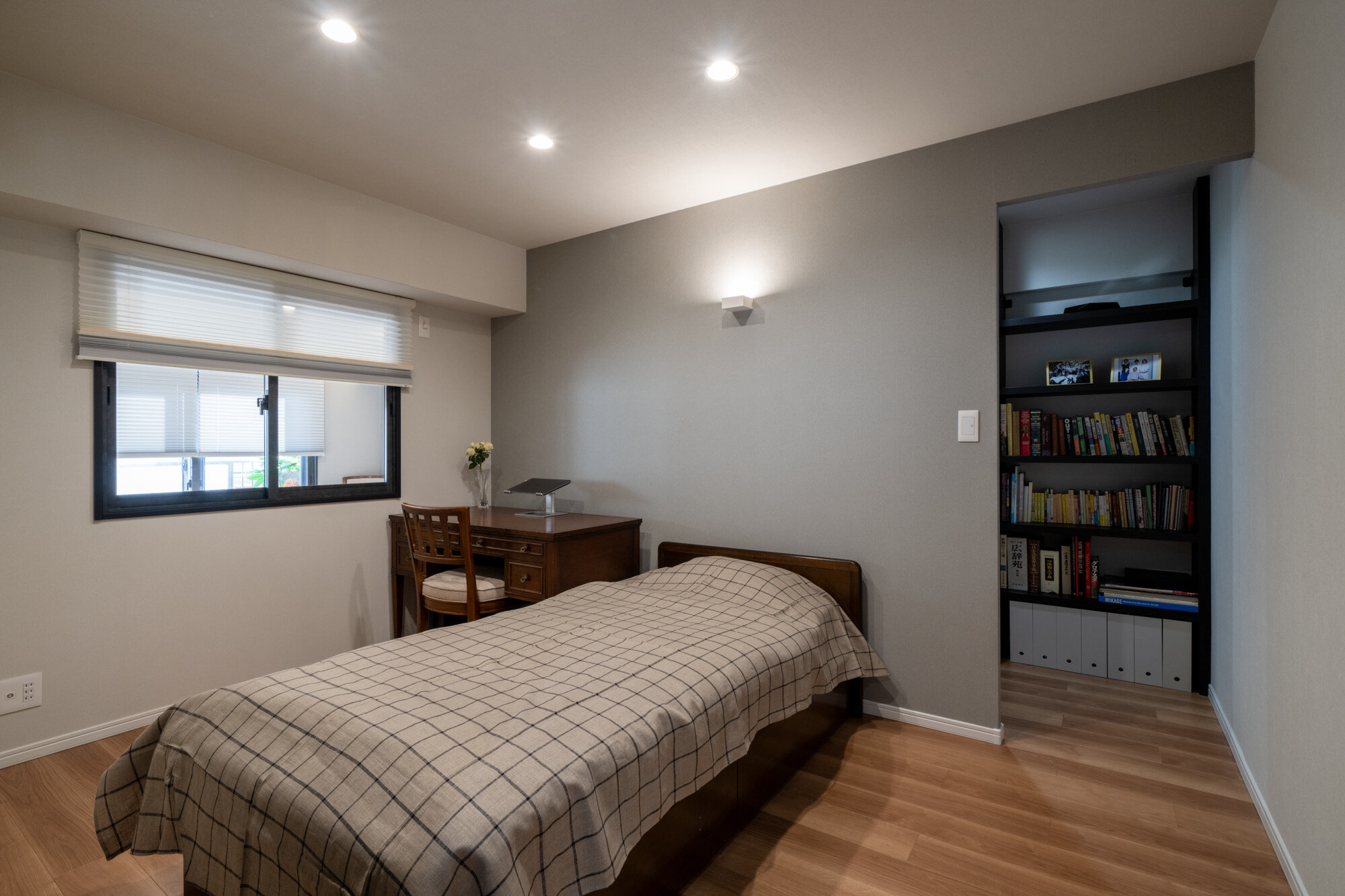 キッチン隣の寝室は室内窓を取り入れ、奥には書棚と収納スペースを設けました。「朝はバルコニー側の窓と室内窓のプリーツスクリーンを電動で開け、明るい光でさわやかに目覚められます」とHさま。玄関横にあった洋室は縮小しホールを広げ、ゲストルームと収納に変更しています。
