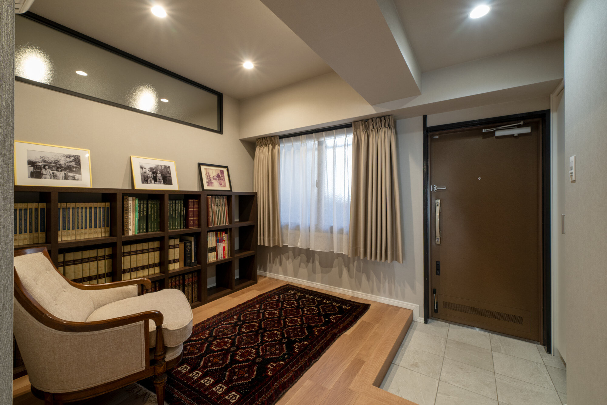 広くなったホールには書棚とチェアを並べ、靴の着脱も簡単に。FIX窓の向こうにゲストルームを設けました。
