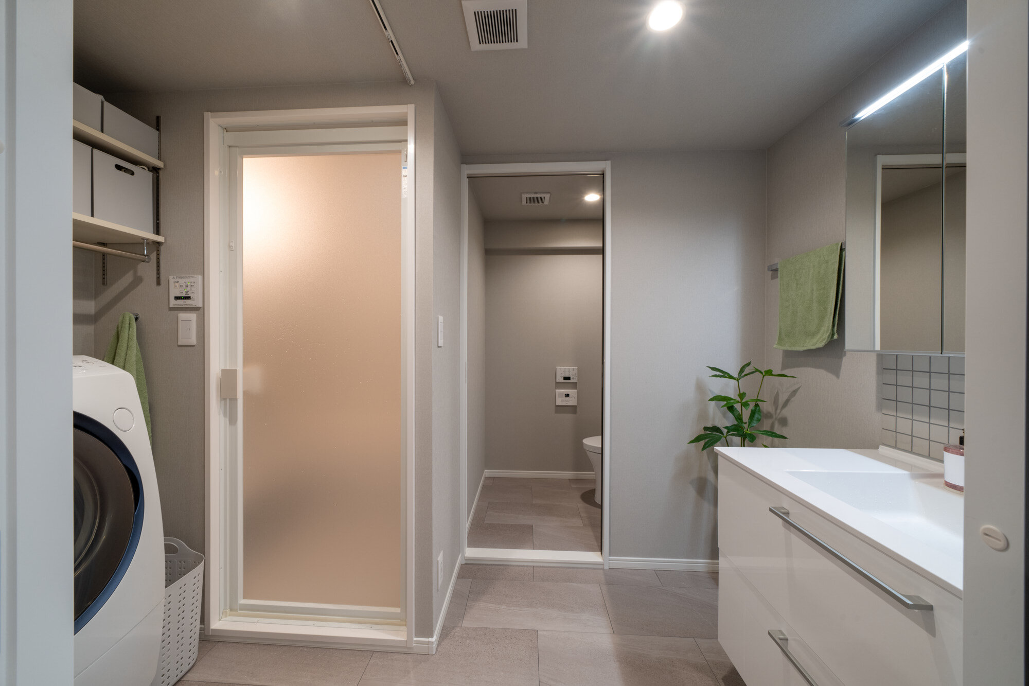 洗面室の中央にカーテンレールを取り付け、入浴時は脱衣部分と間仕切りして使えるようにしています。