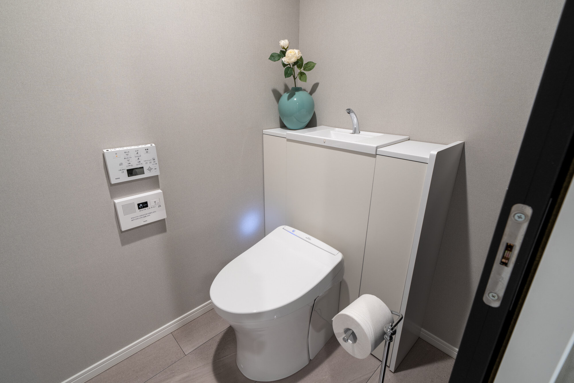 タンクレスのようにすっきりとしたデザインのトイレ。使用音対策として擬音装置を取り付けました。