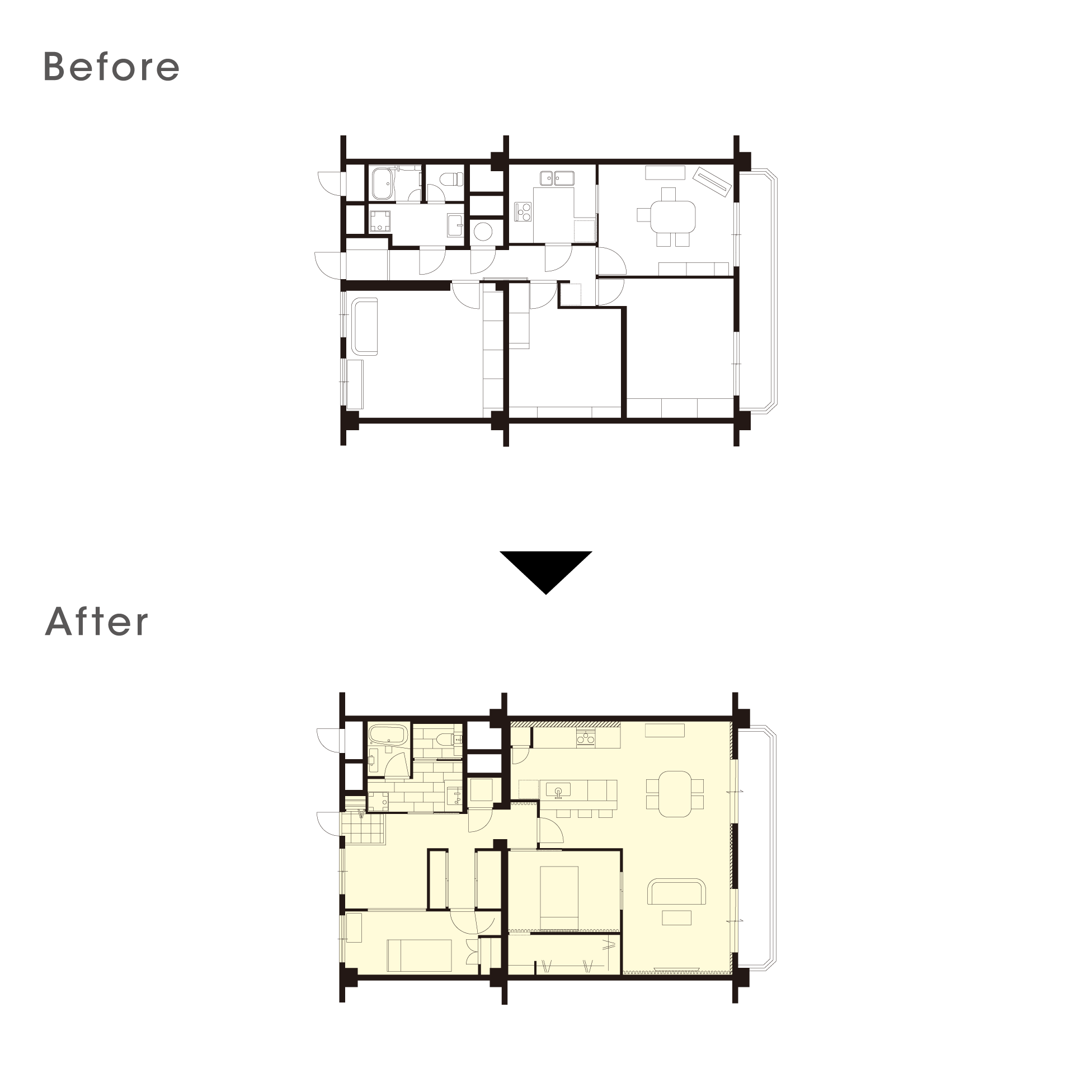 Hさまはご両親から受け継がれたマンションの全面リフォームを希望されました。まずリビングダイニングとバルコニー側の洋室、キッチンとの間の壁を撤去。キッチンは対面にしてLDKを一体化しています。隣にある寝室とは室内窓、廊下側は透明のドアを設けて、見通しのよい空間になりました。
