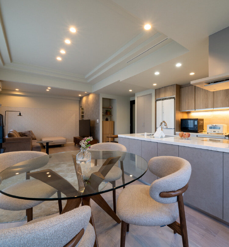 以前は独立型のキッチンで、一部に窓はあったものの「壁に向かって作業するのは孤独感がある」というのがお悩みでした。新しいキッチンはペニンシュラ型のフラット対面タイプで、グレイッシュな扉と高級感のあるクォーツカウンターを選ばれています。 ダイニングの窓にはウッドシャッターを取り付け、日差しや視界を遮りつつ風を通すことができるようになりました。