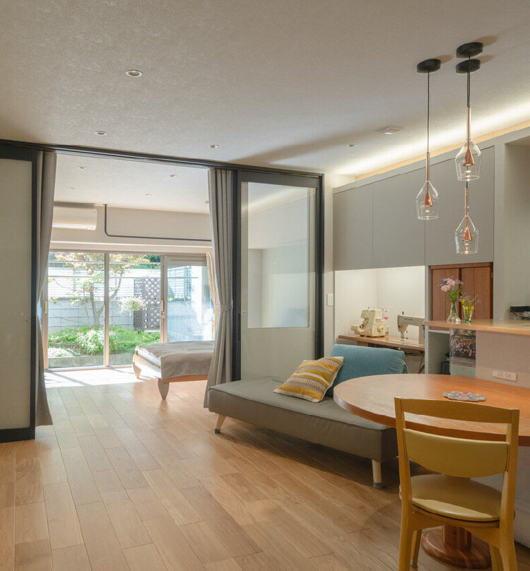長年暮らされたお住まいを、これからの生活スタイルに合わせた間取りにしたいと希望されたHさま。1階住戸で専用庭から寝室、LDKと続き、これまでは寝室とリビングの間に木目調の引戸が設けられていました。「キッチンやリビングから庭を見渡せるように」と、天井まで透明の引戸とFIX窓に取り替えています。開放感があり、明るいLDKが生まれました。