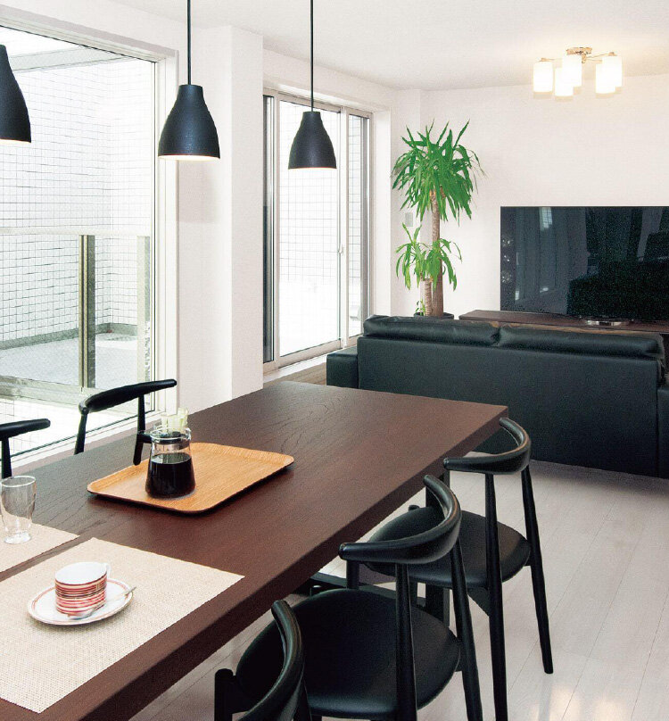 白とダークブラウンの洗練されたインテリア。キッチンやシステム収納などはパナソニック製品で統一。