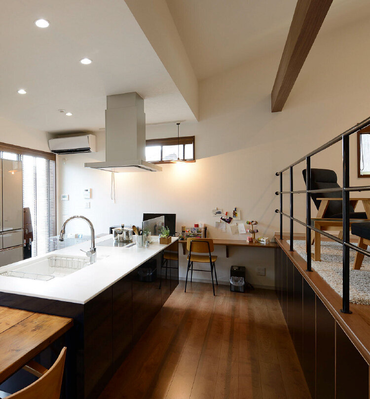 デザインやインテリアにこだわりをお持ちで、「人とは違うカッコいい家」を希望されていたSさま。南面に設けた明るいLDKには、平屋でありながら中二階のスキップフロアをプランニング。勾配天井をうまく生かして、わくわくするような空間を実現されました。インテリアは木の風合いを感じるフロアや建具、存在感のある木のダイニングテーブルでナチュラルに。あえてふぞろいにした照明や椅子、アイアンの手すりがカフェのような居心地のよさを生み出しています。