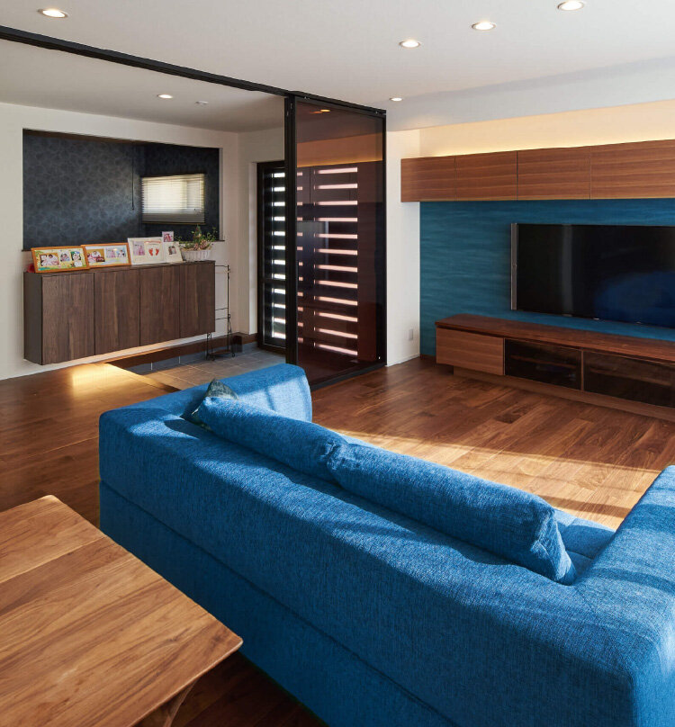 インテリアは、ウォルナットを基調とした落ち着いた雰囲気。玄関ホールの自然な風合いのタイル壁やリビングのブルーのクロスがシックなアクセントになっています。