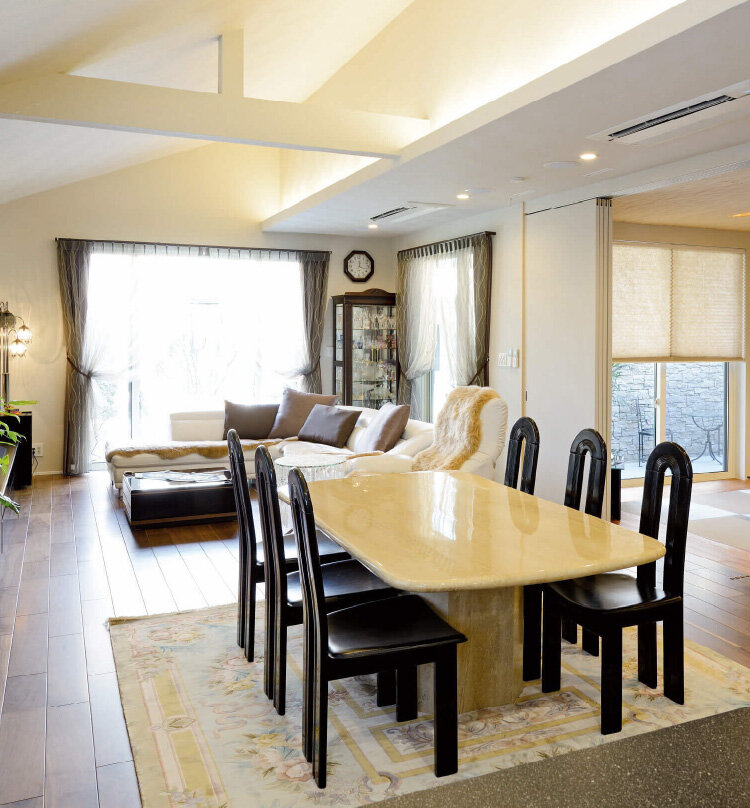 ご自宅にお客さまを招いてにぎやかに過ごされる機会が多いことから、間取りは細かく仕切らず開放的に。勾配天井でのびやかさを高めたLDKは、天井に仕込んだ間接照明がくつろぎに満ちた空間を演出します。LDからオープンに続く和室は、琉球畳に杉板の天井材やシックなクロスの床の間を合わせて高級感のある雰囲気に。引き戸で仕切れば客間として重宝します。
