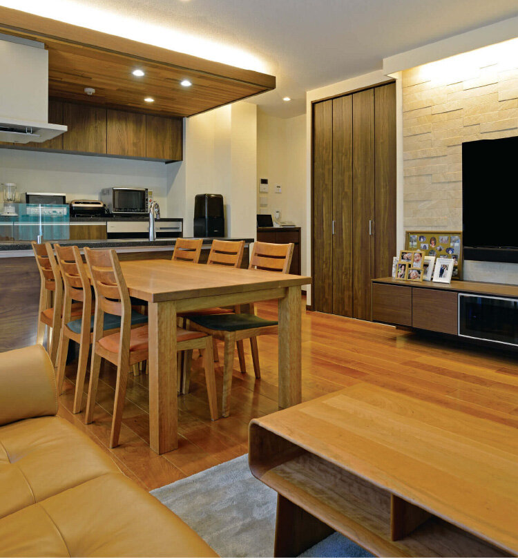 ご家族がくつろぐLDKはシックなインテリアで落ち着いた印象に。ナチュラルなブラウンのフロア、ウォルナットの建具や下がり天井など、木の質感を随所に生かされました。やわらかな光が広がる間接照明や意匠性に優れた調湿壁エコカラットも上質感を醸し出しています。キッチンはオープンなアイランドタイプで、収納もたっぷり確保。洗面・浴室への動線がよいので、家事を効率的にこなせます。