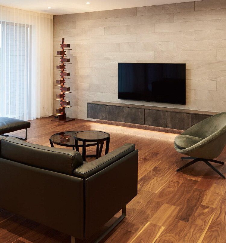 約35畳の広々としたLDKは、ブラックウォルナットの木質フロアで落ち着いた雰囲気に。「飽きのこないインテリアをめざしました」と奥さま。