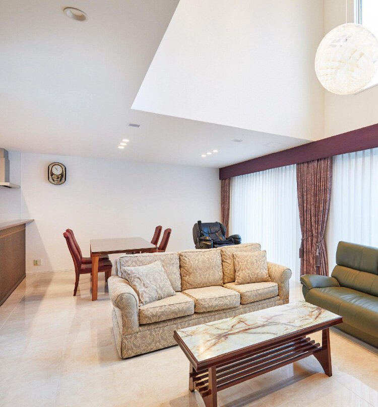 お住まいの中心は、大きな吹抜けのあるLDK。南面に連続して設けたワイドな開口部が開放感を高めています。エレガントな色柄のクロスを随所に採用して、広い空間のアクセントに。それぞれ違う色柄のクロスでも好みのテイストに揃えて、統一感のあるクラシックな雰囲気になりました。「ゆったりくつろげるのでほとんどLDで過ごしていますね」とご夫妻とも居心地のよさを実感されています。