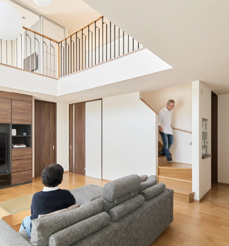 二世帯がほどよい距離で過ごせる配慮として、2階にご夫妻専用のセカンドリビングを設けられました。引き戸を開けると、吹抜け越しにLDKともつながる開放的なスペースです。また、ご家族それぞれの個室も充実。玄関やLDK、水まわりからも近い場所にお母さまの部屋を。2階にはご主人の寝室兼書斎の他、奥さまと娘さまの部屋を共有のウォークインクローゼットを通してつながるように配置されました。