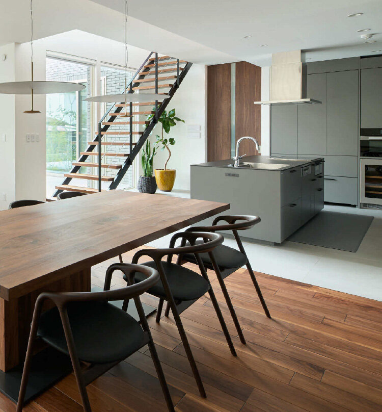 Kさま邸は、中庭を囲むようにLD、キッチン、和室を配置したプラン。大開口で内と外がひと続きになり、季節の潤いを暮らしに取り入れています。南面のテラスや中庭につながるリビングは、明るい日差しに満ちた心地いい空間。インテリアはウォルナット材やグレーを基調に、上質な家具や照明をセレクトされました。アイランドキッチンからは、シースルー階段越しに中庭へと視線が抜け、LDK全体にも目が届きます。「キッチンに立つのが楽しくなりました」と奥さま。