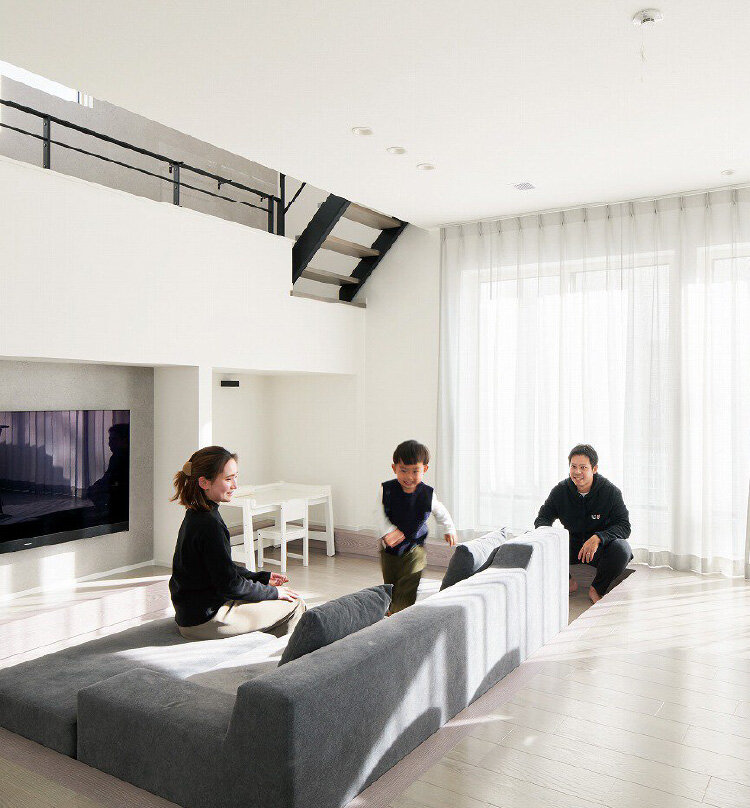 Sさまがこだわられたのが、変化に富んだ団らん空間です。リビングはダウンフロアにして、ゆったりとくつろげるスペースに。「天井が高く感じられますし、とても居心地がよくて、家族みんな気に入っています」。中二階のような通路でつないだ印象的な階段は、奥さまのご希望で実現。階段下は、テレビコーナーやキッズスペースとして有効活用されています。また、ご夫妻で料理をされる機会が多いことから、アイランドキッチンは背面にゆとりを持たせて配置されました。インテリアは、淡いグレーと白を基調にしてコーディネート。楽しい団らん空間をスタイリッシュに演出しています。