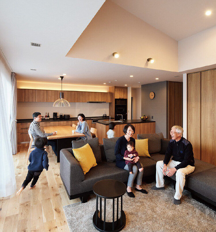 「将来、車椅子でも生活しやすいように」と、バリアフリーにも配慮されました。寝室や水まわりは引き戸にし、適所に手すりを設置。さらにLDKと玄関や廊下の間には建具を設けず、目隠し壁で緩やかに仕切る間取りなので、移動もスムーズです。「ヒートショックを防ぐために全館空調を採用しました。家中がいつでも快適ですね」。心地よく過ごせるご新居で、ご夫妻でゆったりと、時には大勢でにぎやかに、充実した日々をお過ごしです。